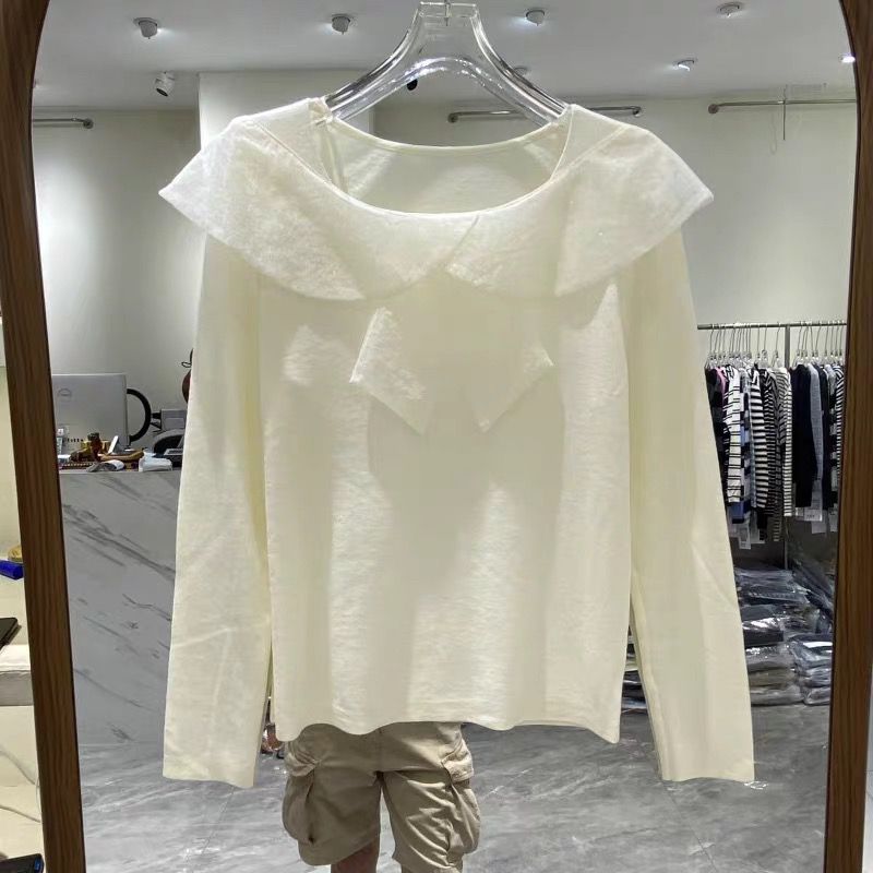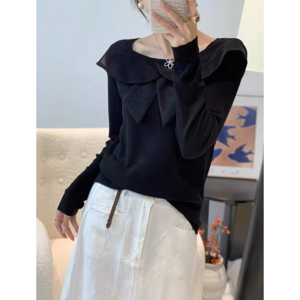 禁止机洗~8526秋款百搭花瓣领拼接网纱修身羊毛针织衫打底上衣女