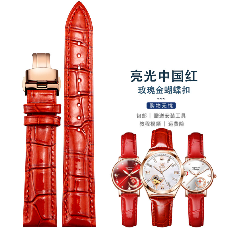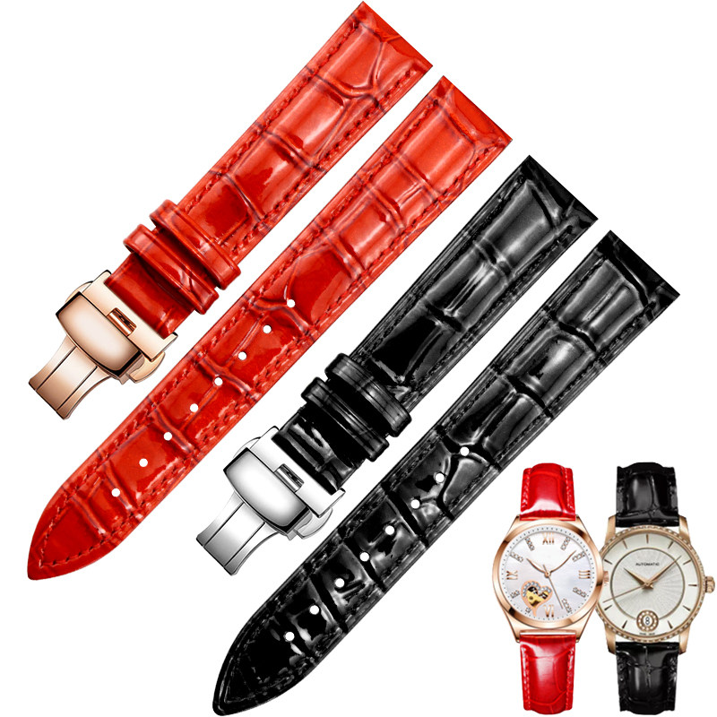 表带真皮女红色亮皮蝴蝶扣适配天梭TISSO杜鲁尔T099心媛T050 16mm