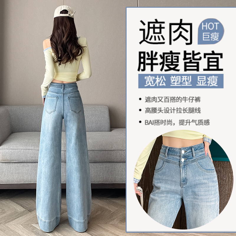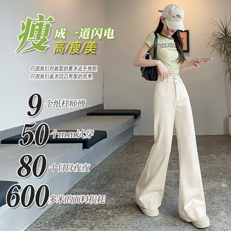 米白色弹力大喇叭阔腿牛仔裤女2025秋季新款宽松显瘦不贴腿拖地裤