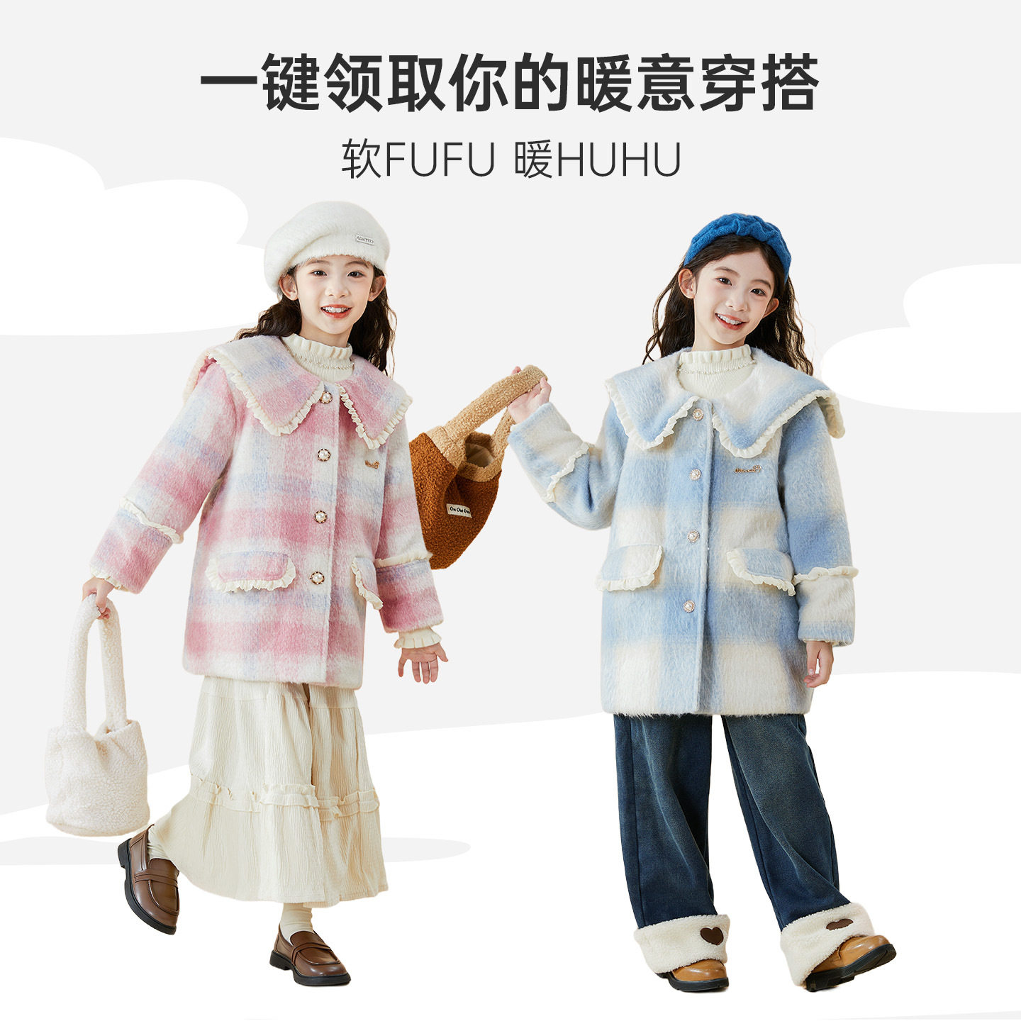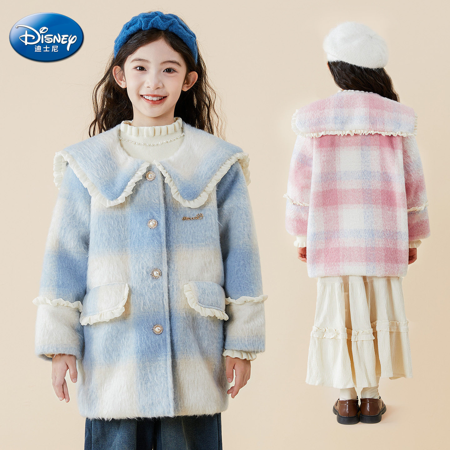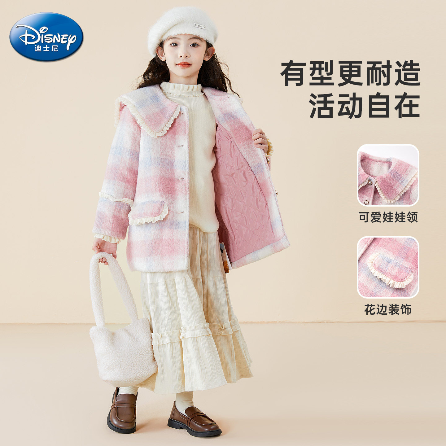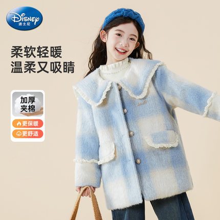 迪士尼女童毛呢格子大衣25冬时髦格纹三层夹棉保暖中长外套棉袄