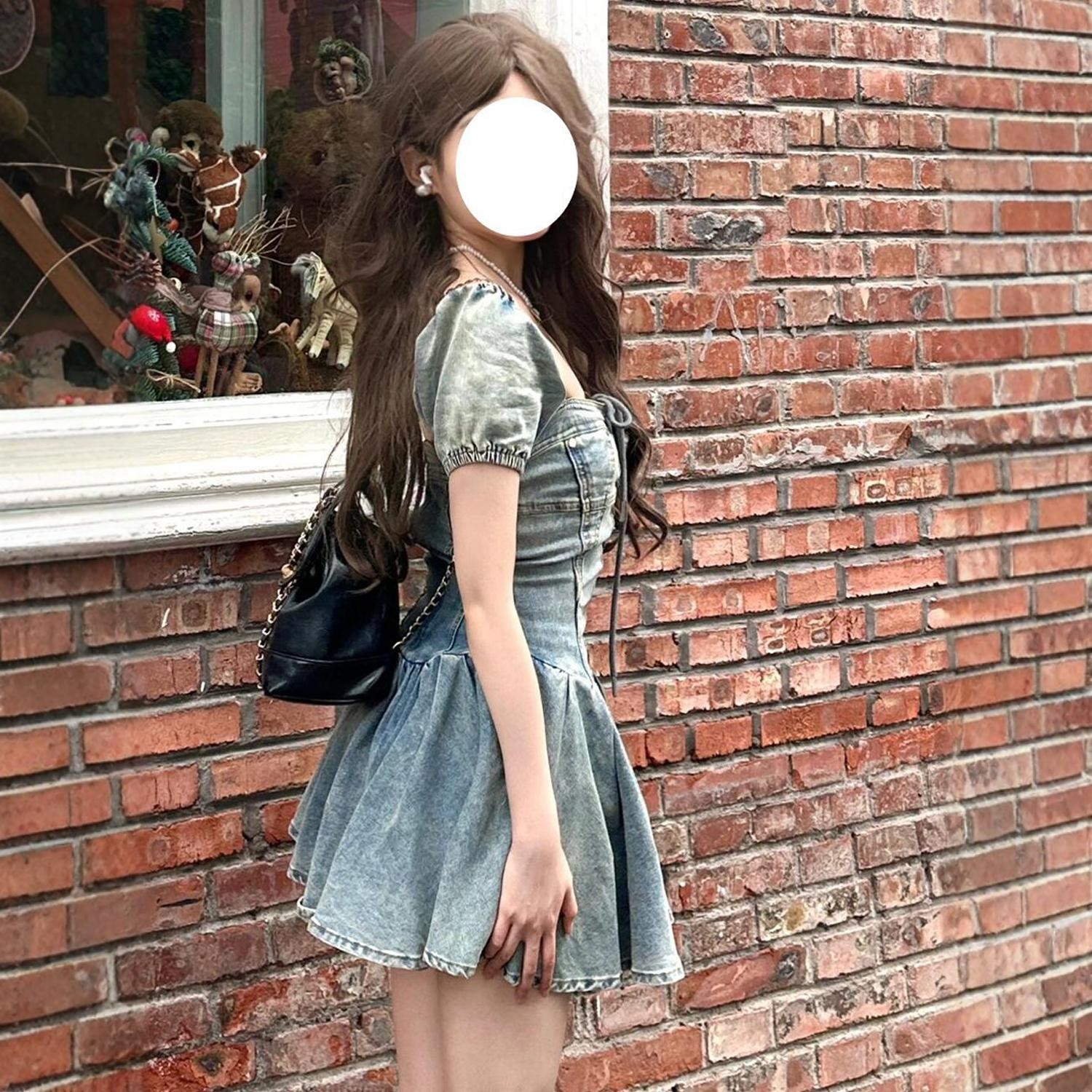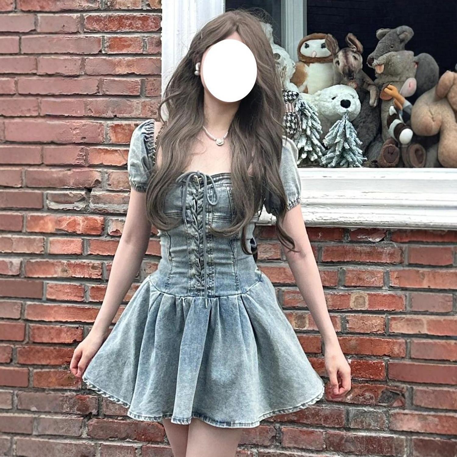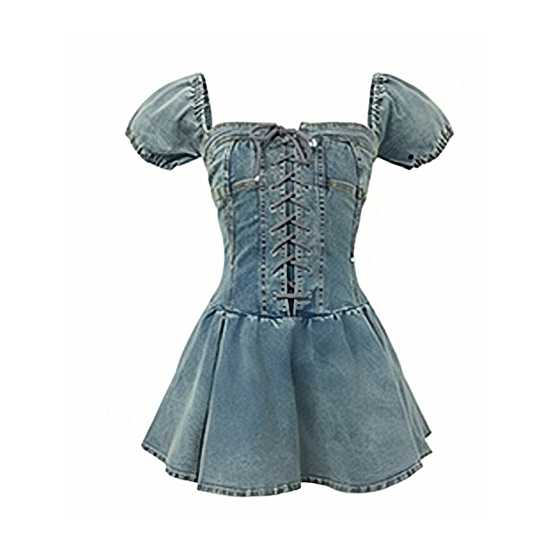 抹胸牛仔连衣裙女夏季新款收腰甜辣生日礼裙复古绑带泡泡袖短裙