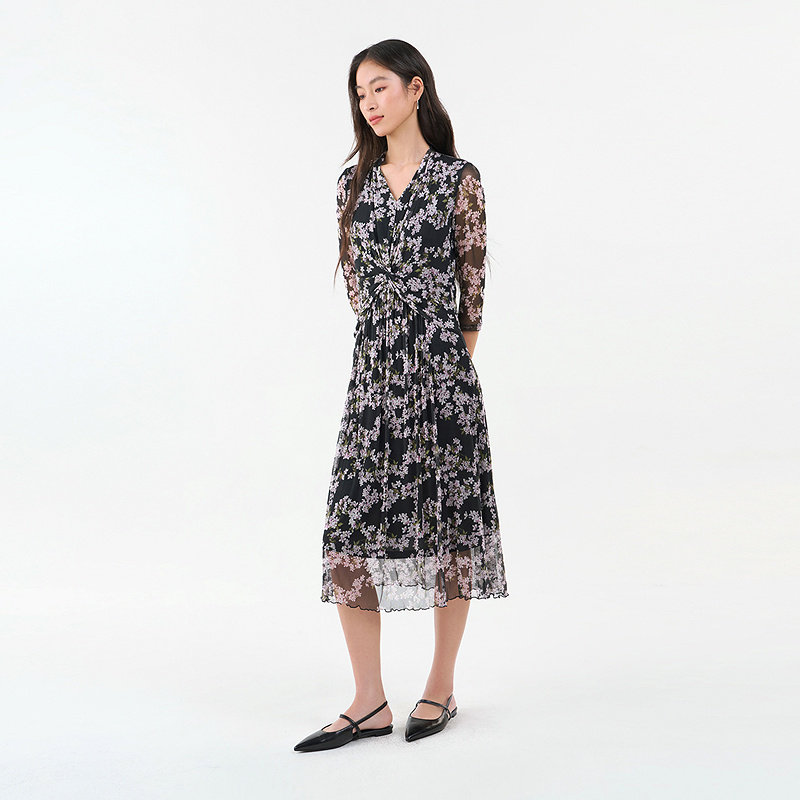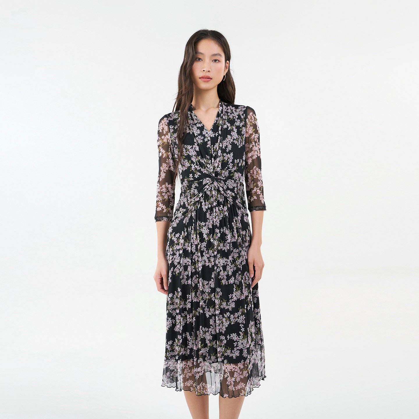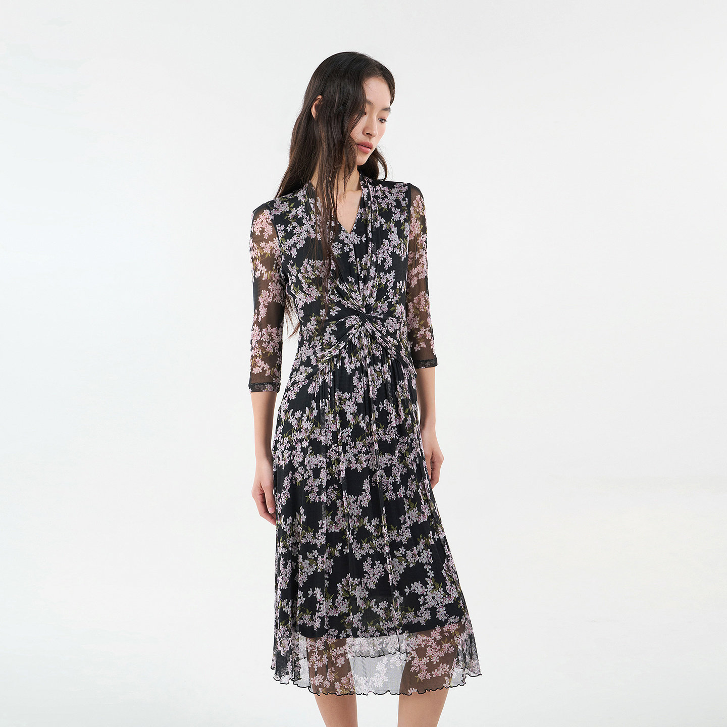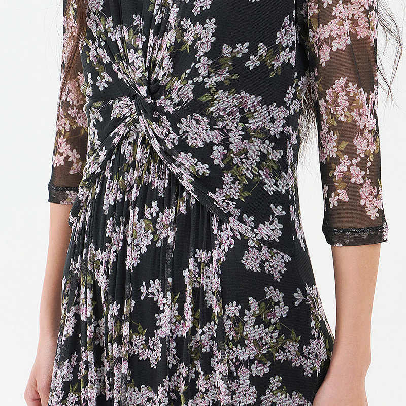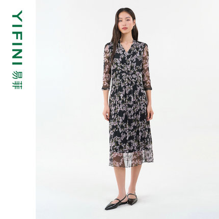[专柜同款]Yifini/易菲100%真丝网眼印花V领腰部扭结中袖连衣裙女