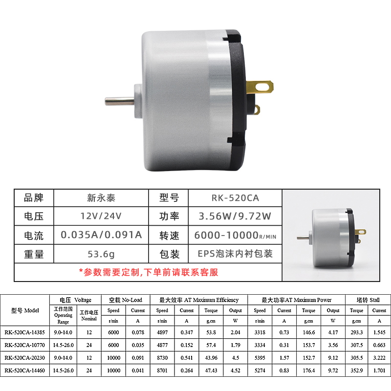 新永泰R520直流有刷高速电机6v12v24v大功率马达小型可调减速电机