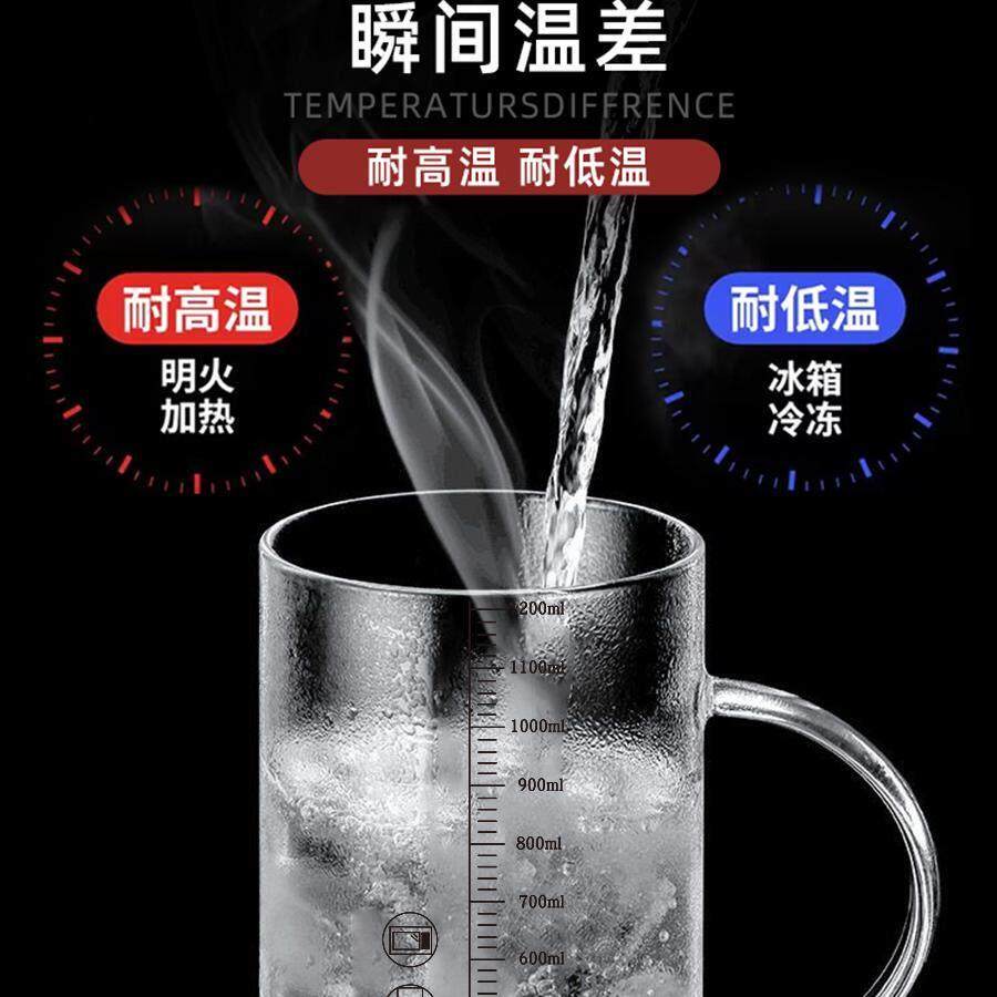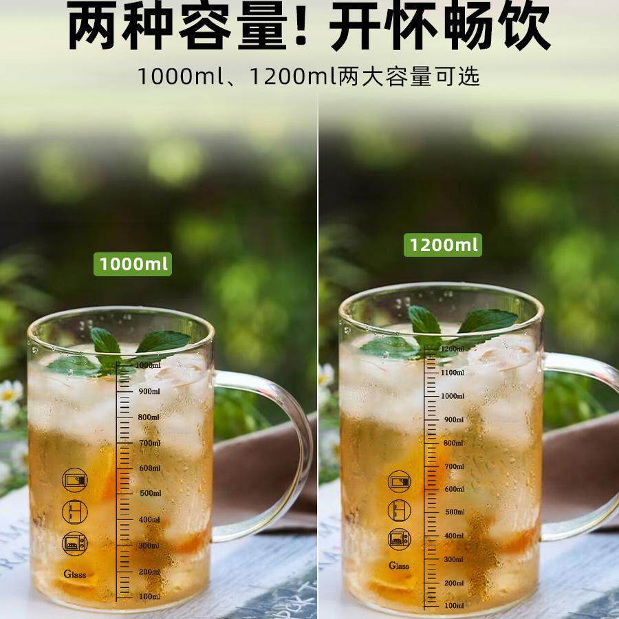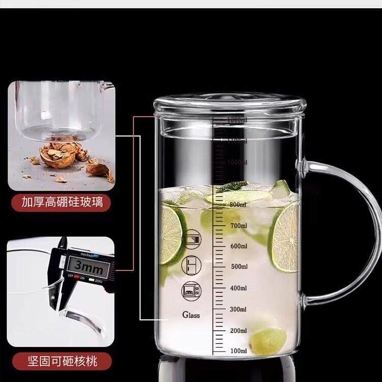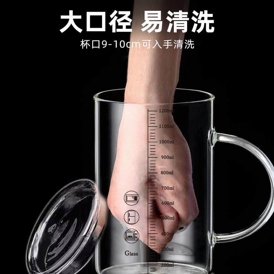 1000ml大口径玻璃杯大容量水杯家用耐高温刻度杯子高硼硅茶杯带盖