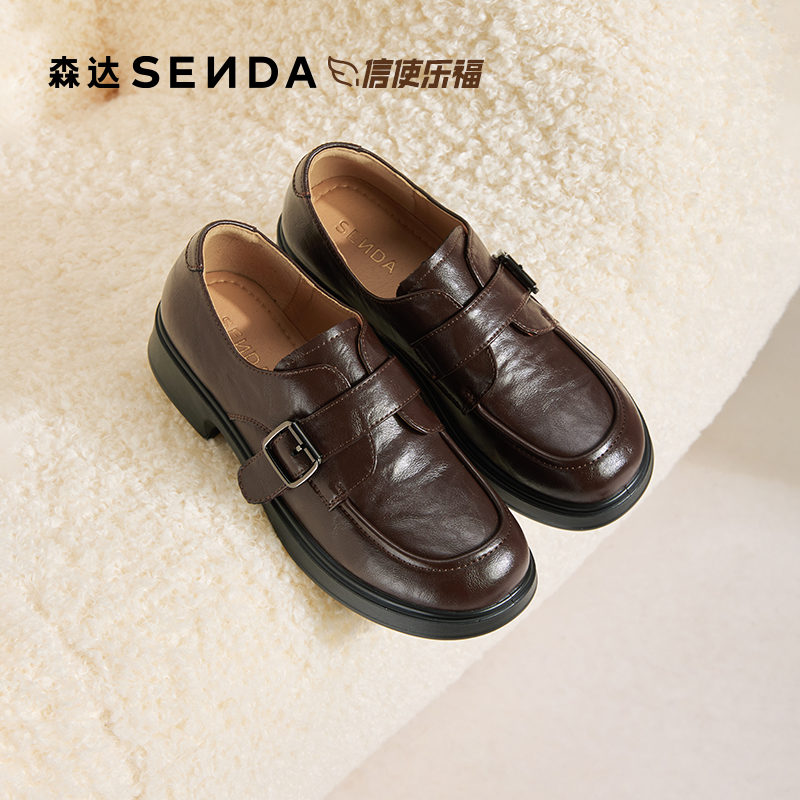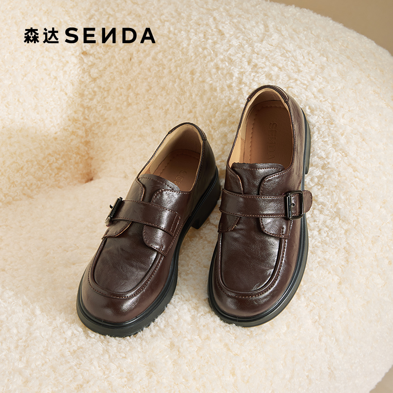森达新款乐福鞋棕色女鞋厚底牛津商场同款软底复古英伦黑色单鞋