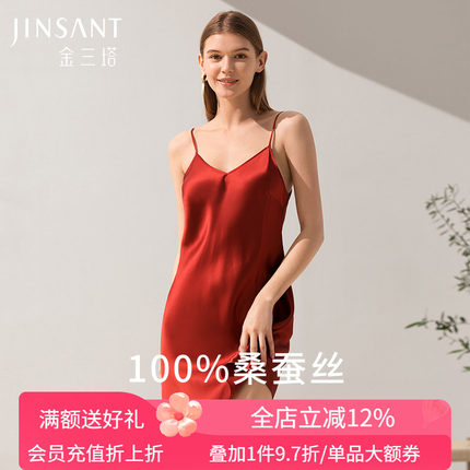 金三塔真丝吊带睡衣女春夏薄款100%桑蚕丝舒适显瘦丝绸睡裙