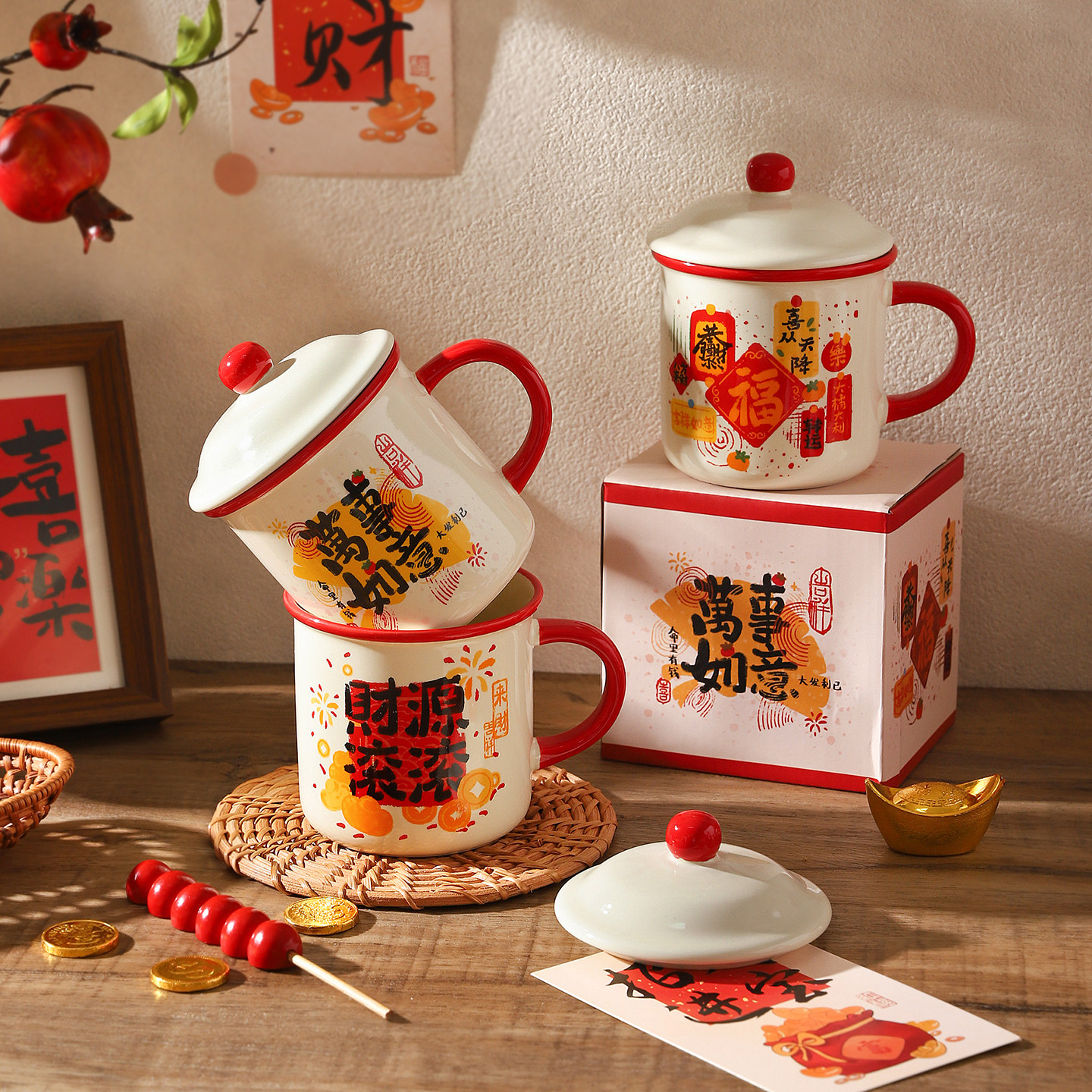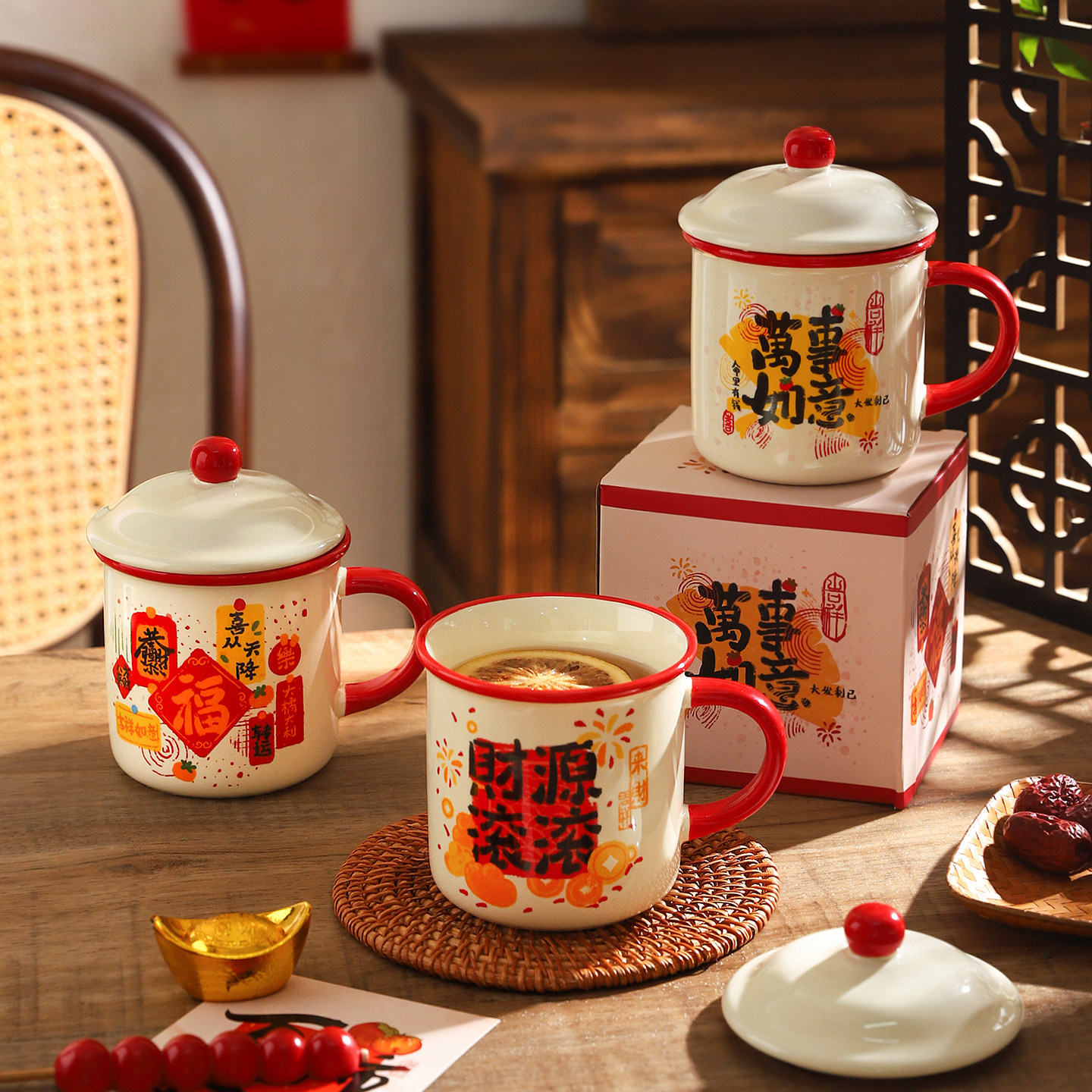 舍里喜庆带盖马克杯家用高颜值早餐杯咖啡杯办公室喝水杯子伴手礼