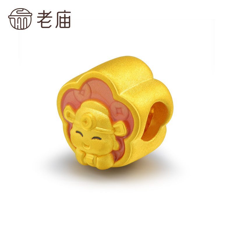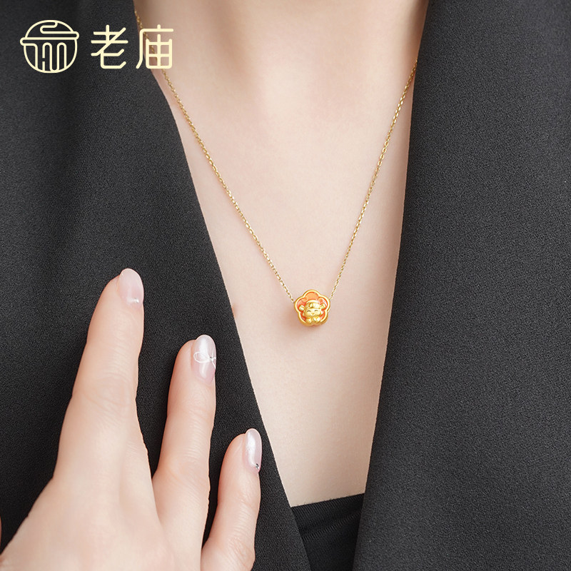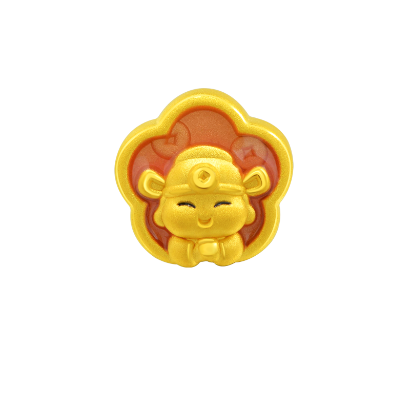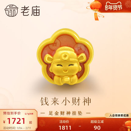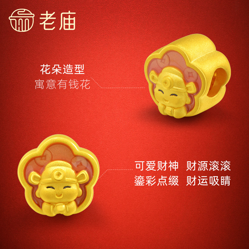 老庙黄金足金小财神挂坠3D精致鎏彩花朵有钱花财神财运滚滚正品