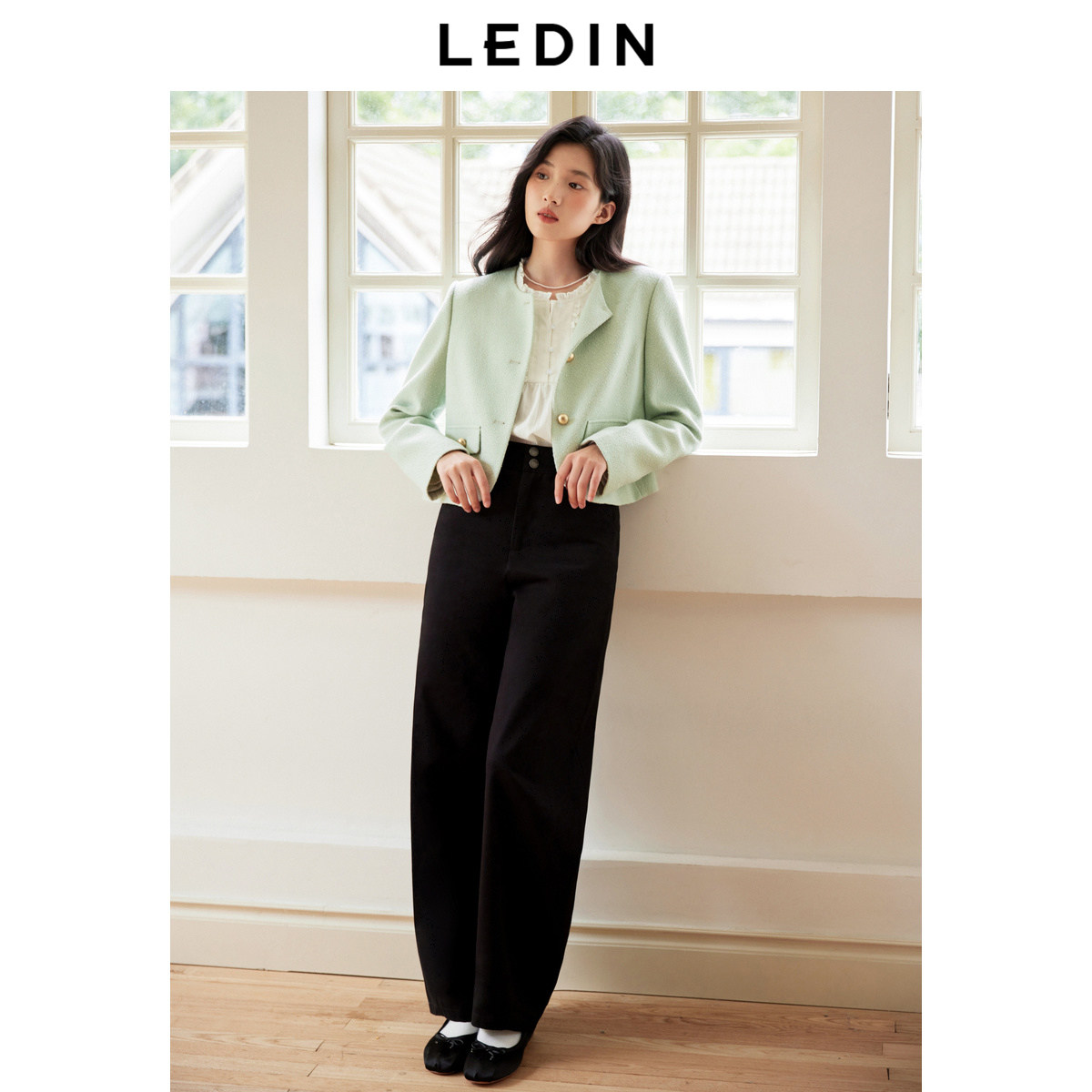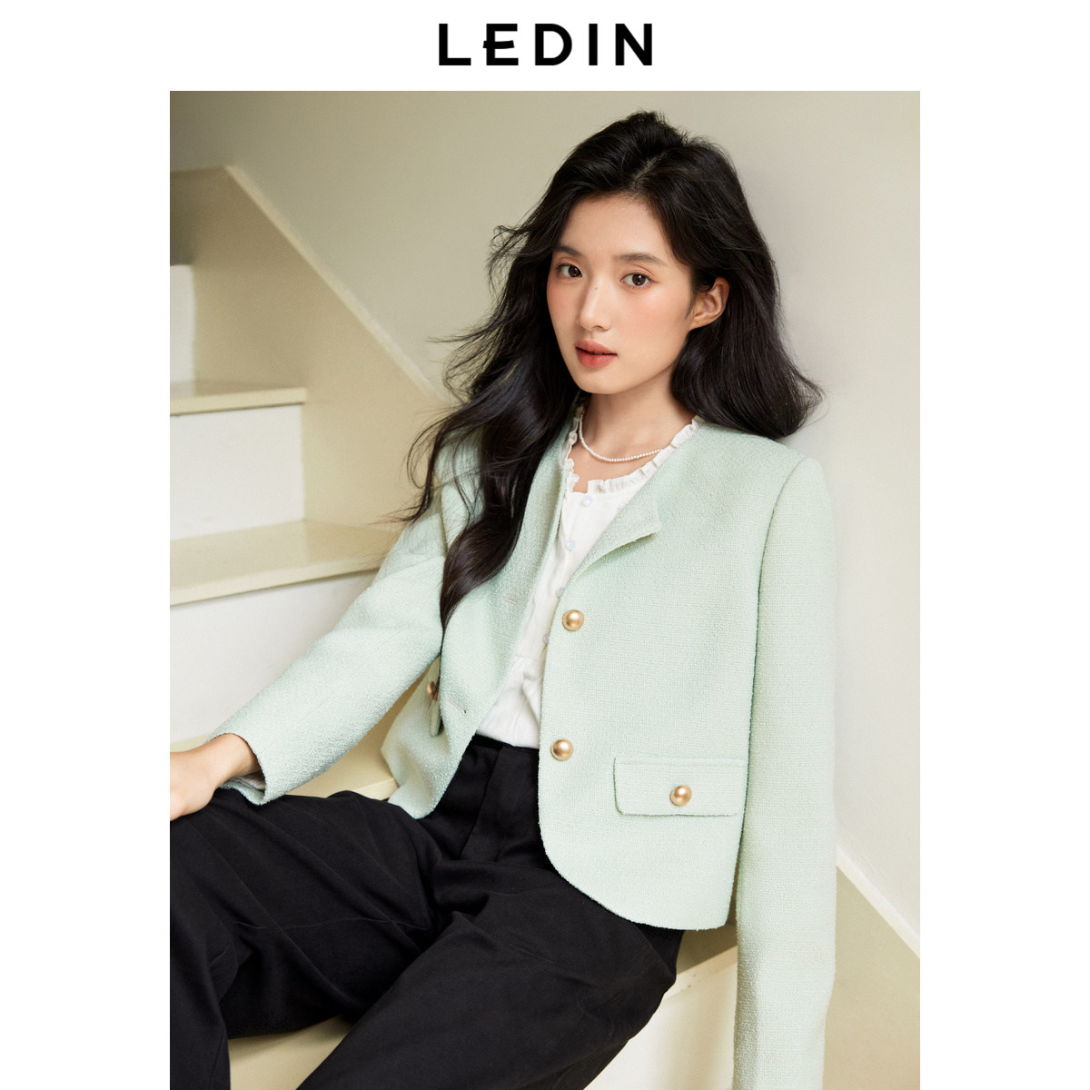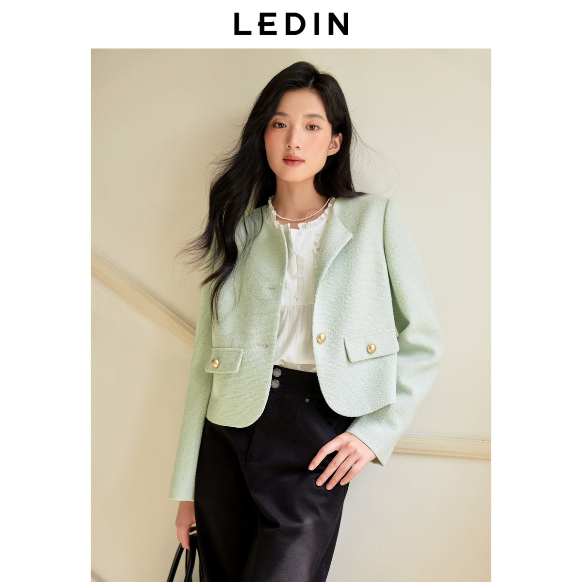 乐町优雅千金感名媛秋季新款撞色金属扣设计正肩圆领小香风外套