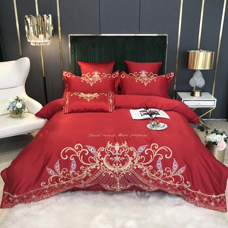 奢华欧式刺绣婚庆四件套被套全棉大红色结婚床单床上用品