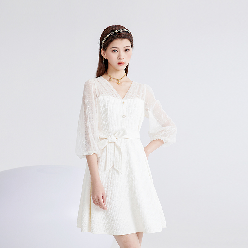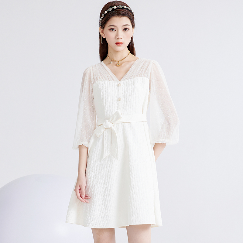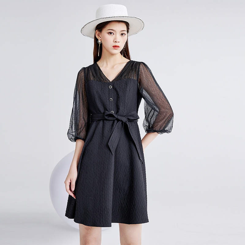 梵凯奶油杏连衣裙拼接薄纱七分袖复古黑色显瘦气质收腰通勤中长裙