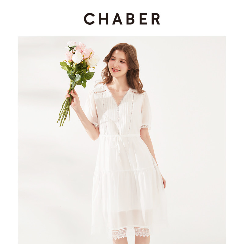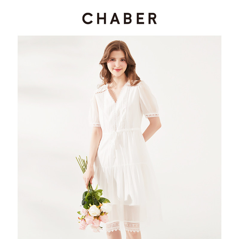 chaber巧帛夏季新款仙气优雅气质显瘦天丝蕾丝边V领收腰连衣裙