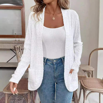 新款欧美2025秋冬雅純色蕾絲双口袋开门襟长袖夹克上衣外套女