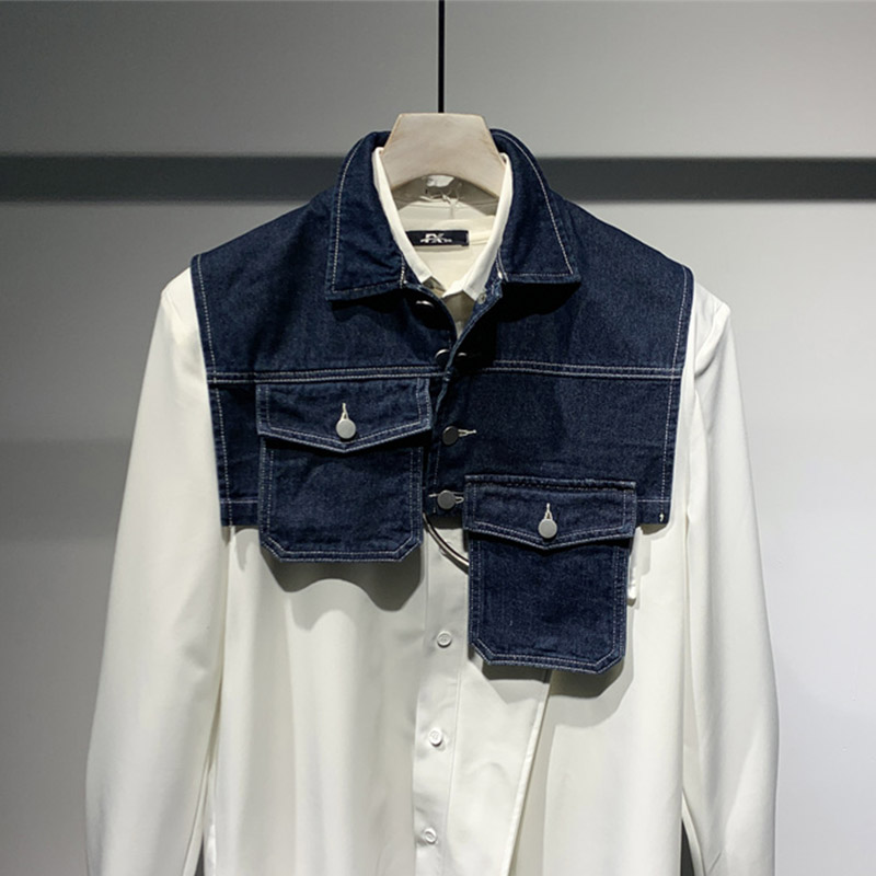 韩版长袖拼接衬衫男秋季新款小众高级感潮流宽松百搭男士衬衣男