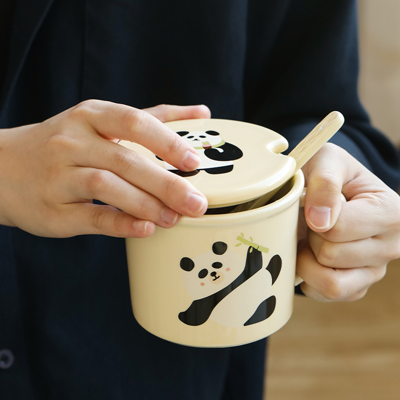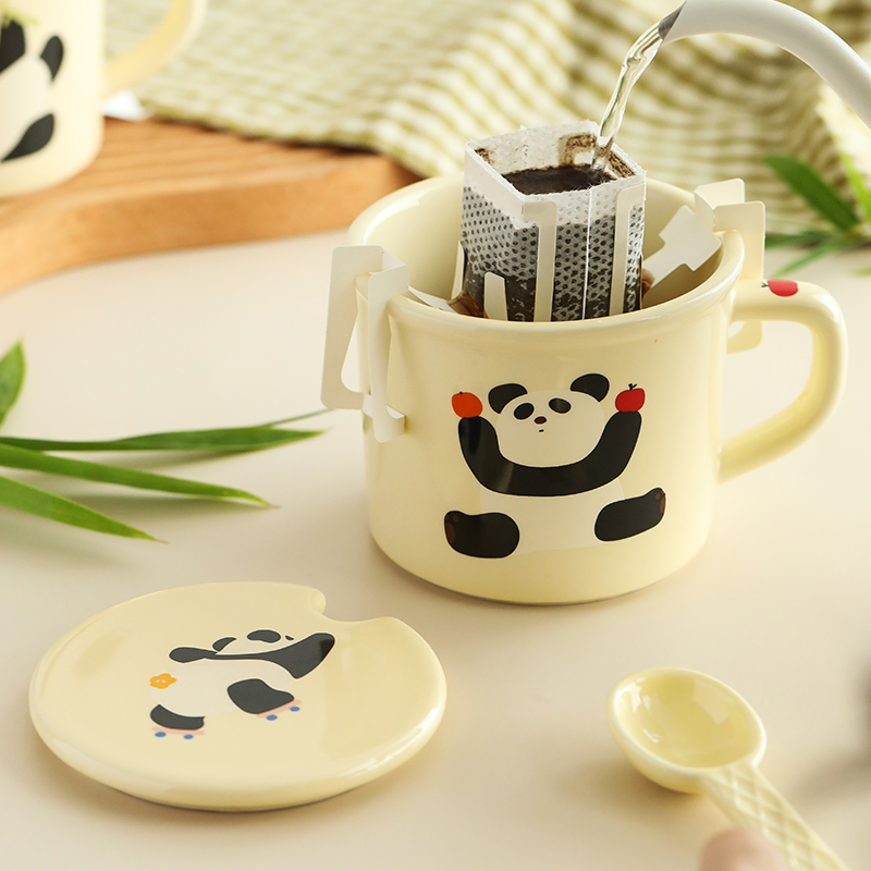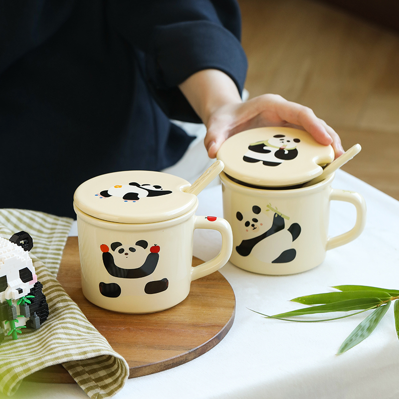 蓝莲花熊猫杯带盖带勺子陶瓷杯子高颜值茶杯可爱女生喝水杯办公室