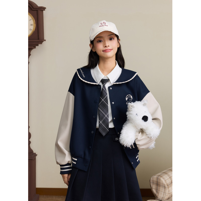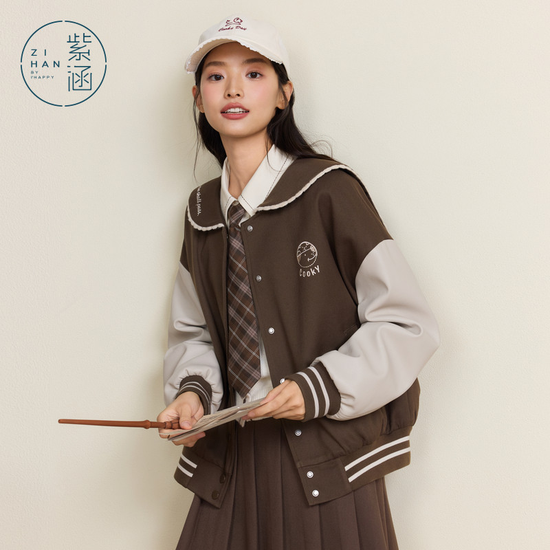 紫涵海军领宽松咖色短外套女秋季新款学院风撞色拼接单排扣棒球服