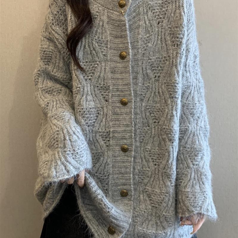 新品宽松慵懒风针织开衫毛衣外套女春秋新款大码胖mm中长款遮屁股