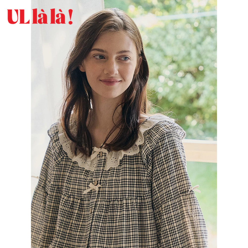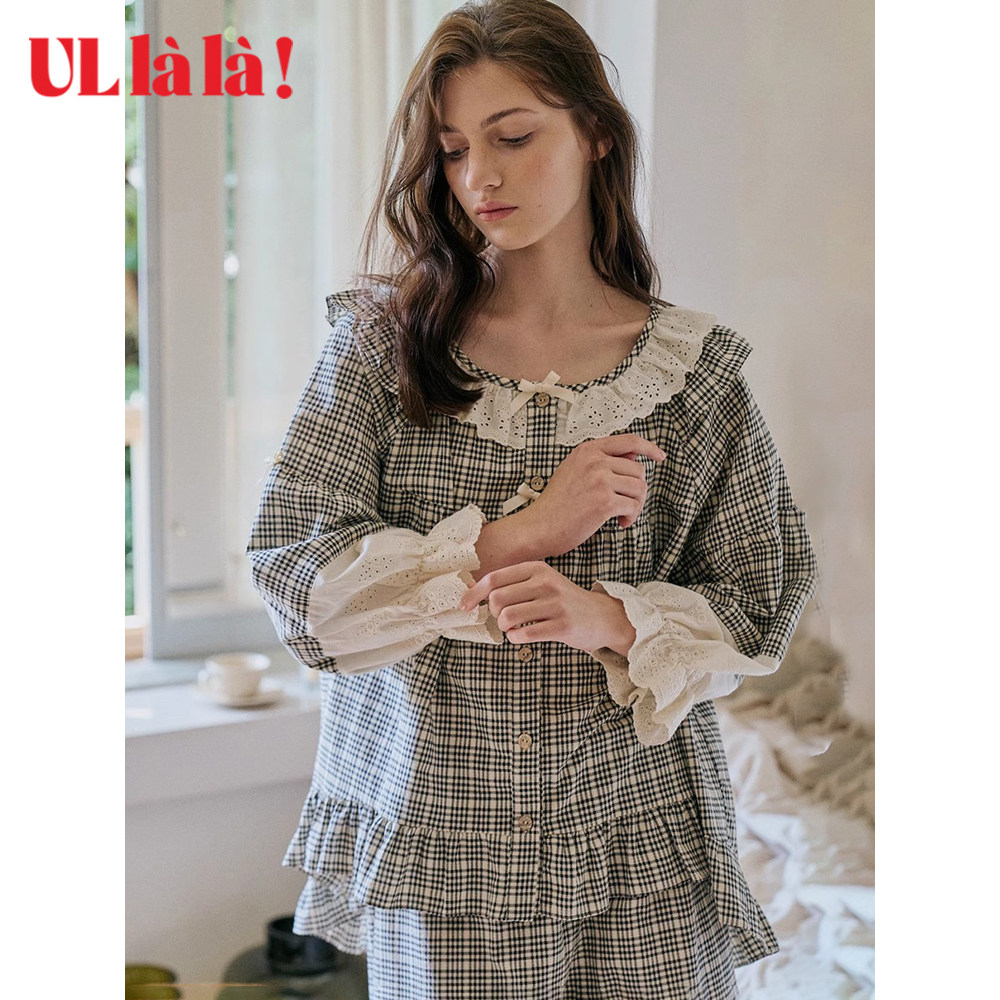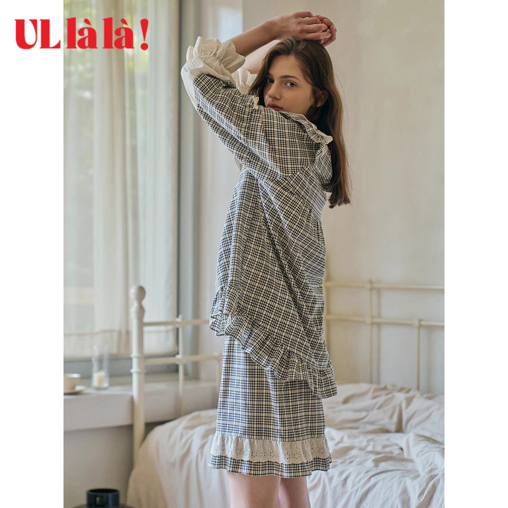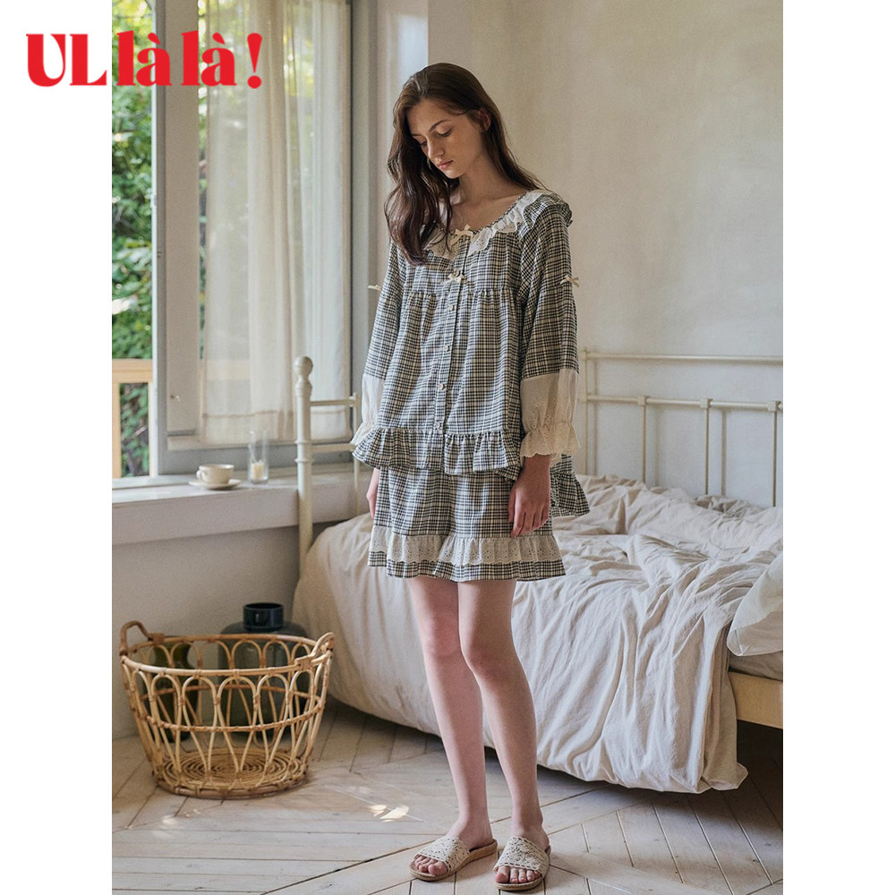 Ullala韩国进口家居服新品减龄睡衣套装休闲格子长袖短裤春夏甜美