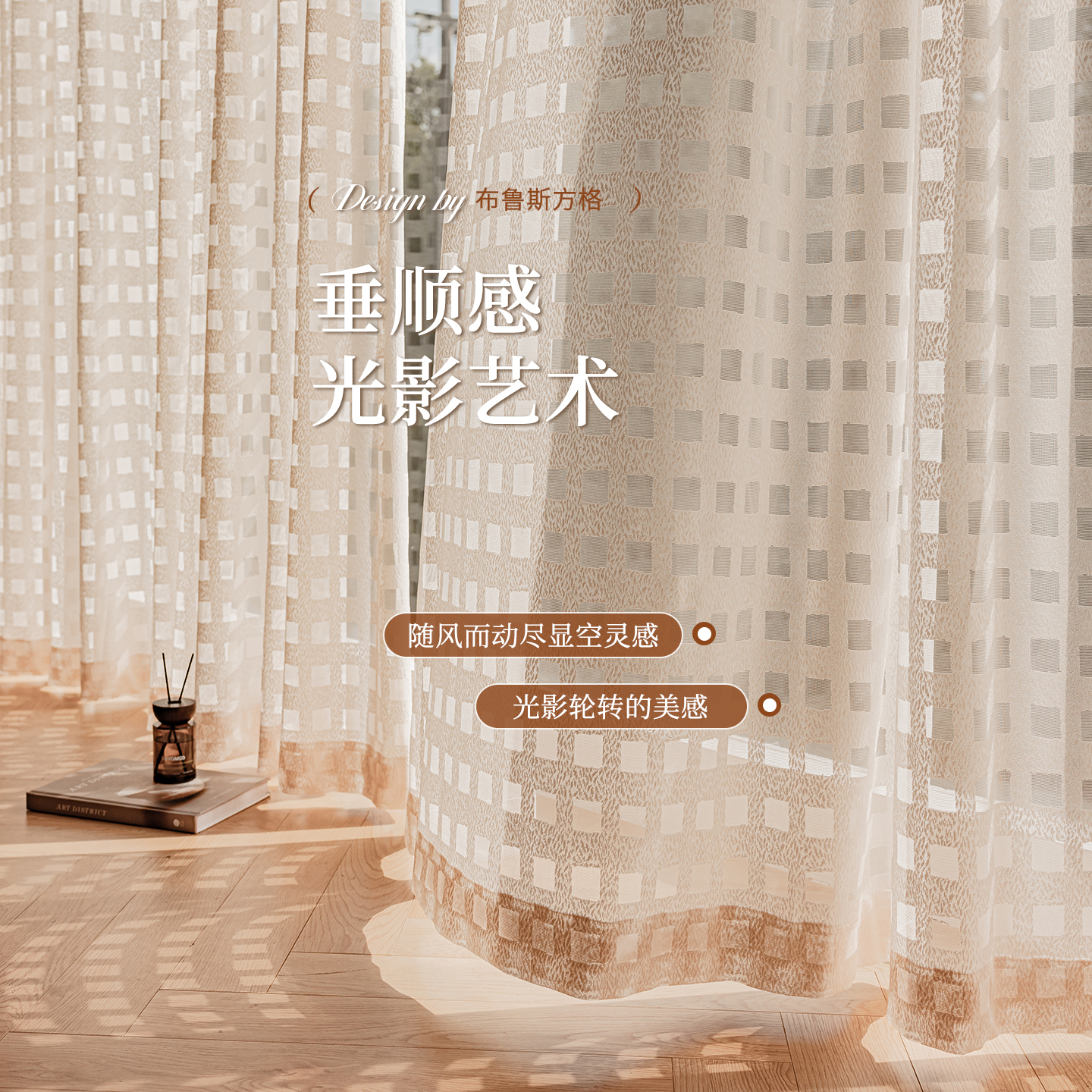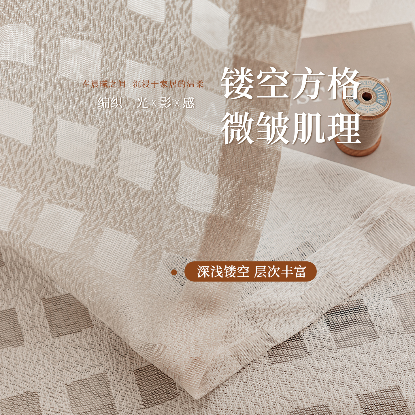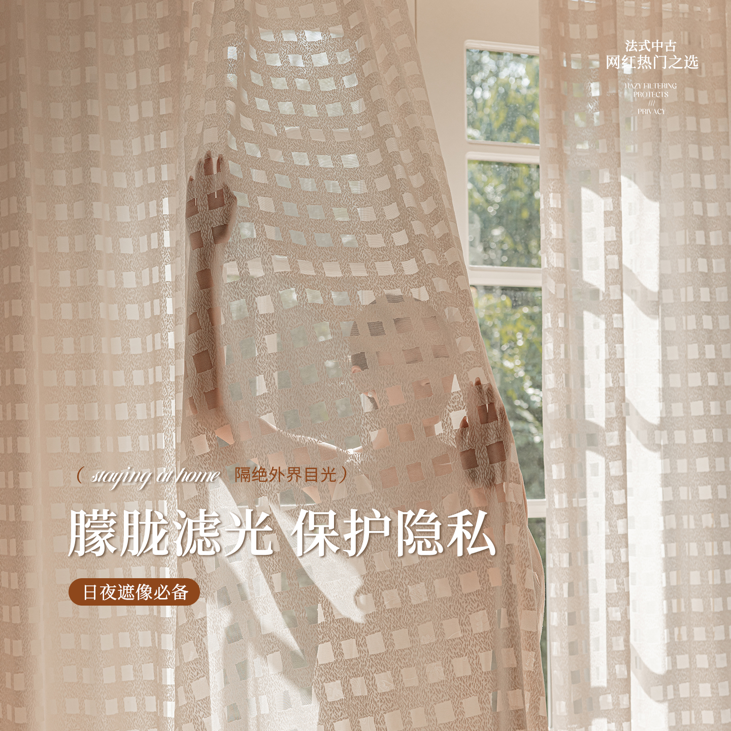 镂空方格纱帘透光不透人法式中古风窗帘客厅阳台遮阳防晒2025新款
