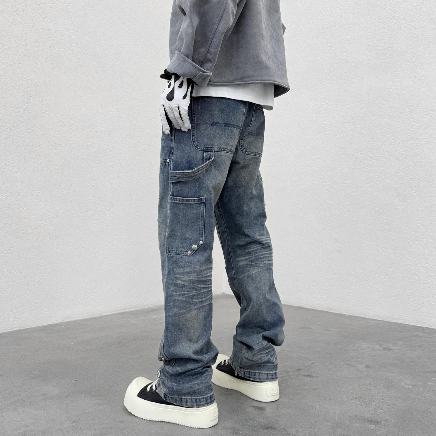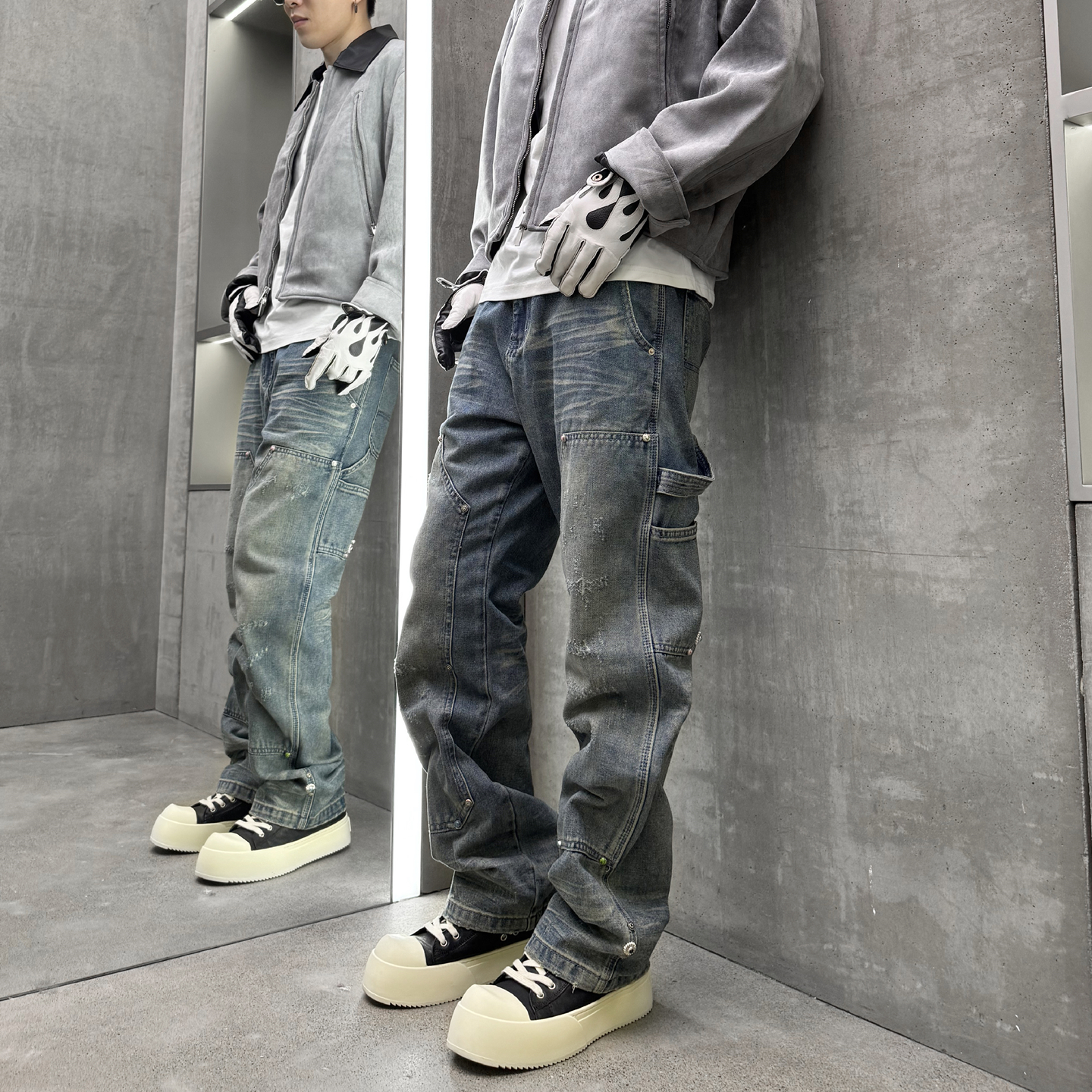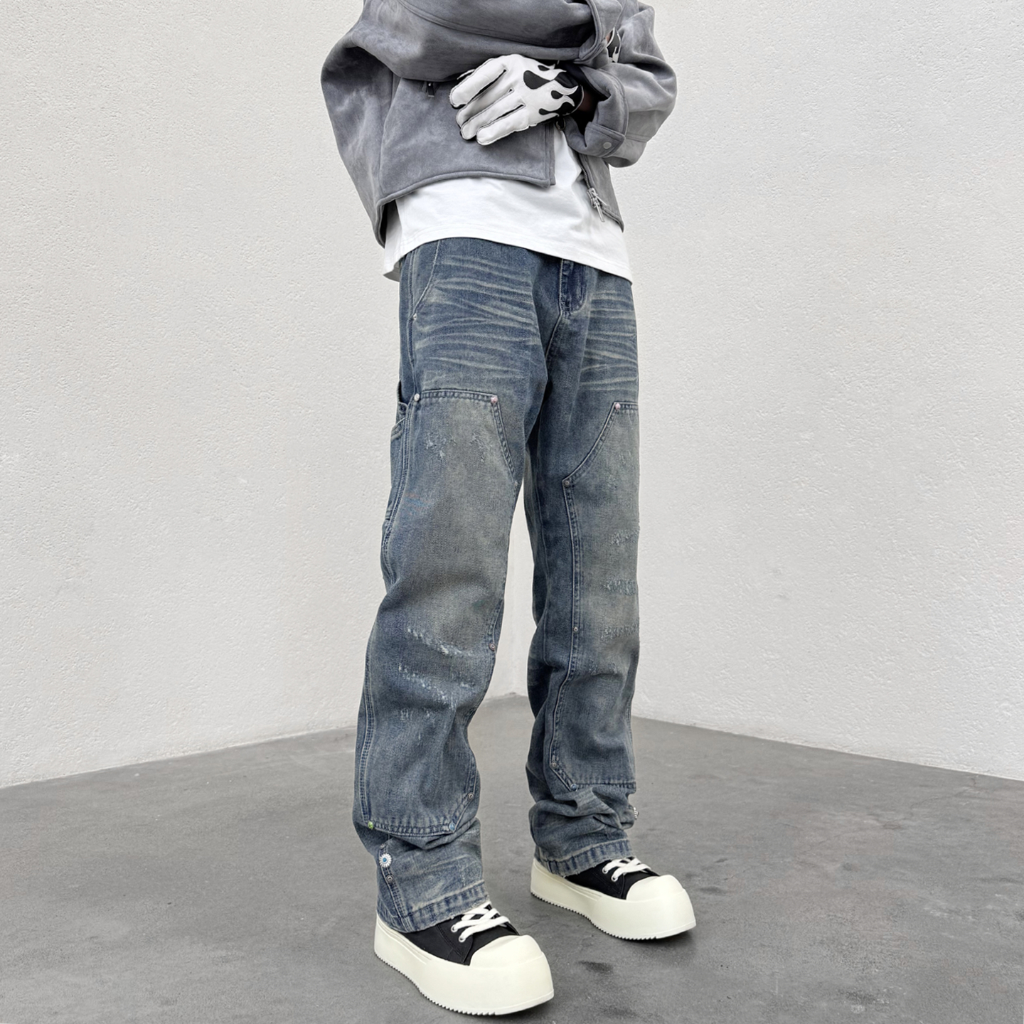 KISSNATE重磅蓝松石柳钉裤人工压绉猫须牛仔裤男女直筒休闲伐木裤