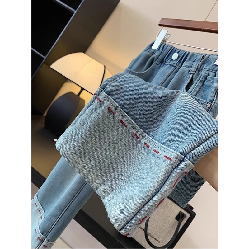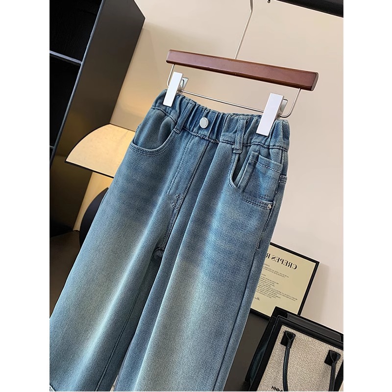 品牌秋款女中大童装百搭高腰卷边牛仔裤儿童宽松水洗直筒阔腿裤