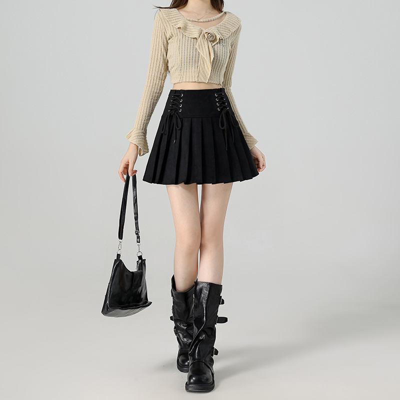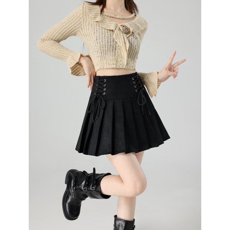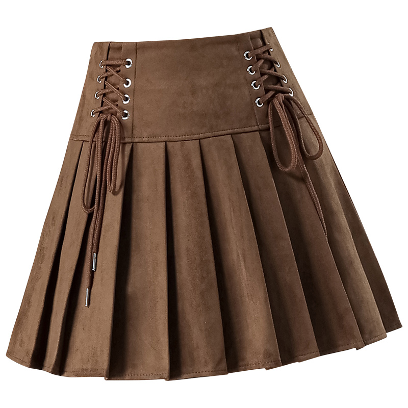 拉夏贝尔咖色鹿皮绒绑带半身裙女秋冬新款美拉德a字防走光百褶裙