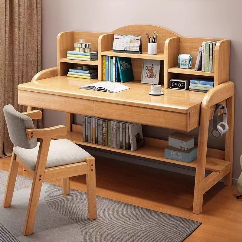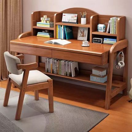 实木书桌可升降儿童卧室家用学生学习桌书房书架一体写字桌椅套装