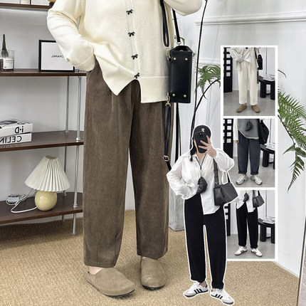 胖MM灯芯绒裤子高腰秋冬新款大码宽松哈伦裤显瘦萝卜裤条绒老爹裤