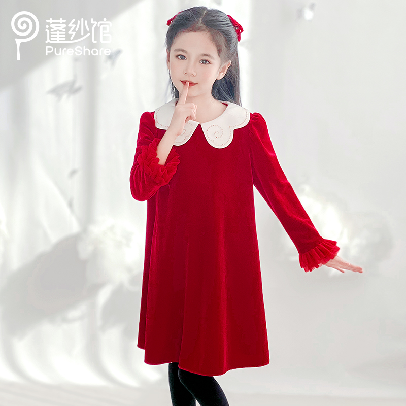 pureshare蓬纱馆 女童连衣裙长袖公主裙2025春秋季新款红色礼服裙