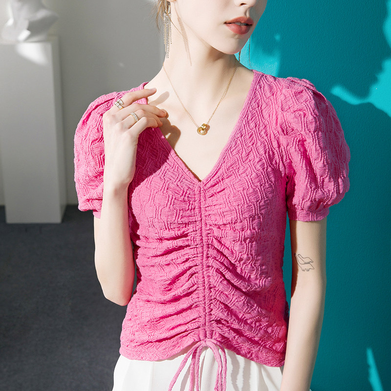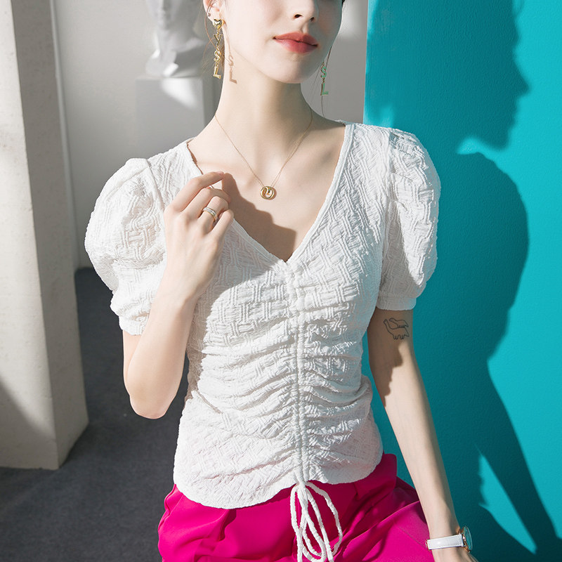 雪纺泡泡袖上衣女短袖蕾丝2025夏季新款抽绳设计女装减龄T恤小衫
