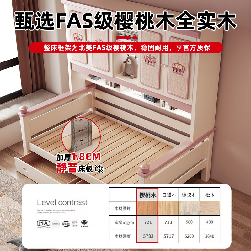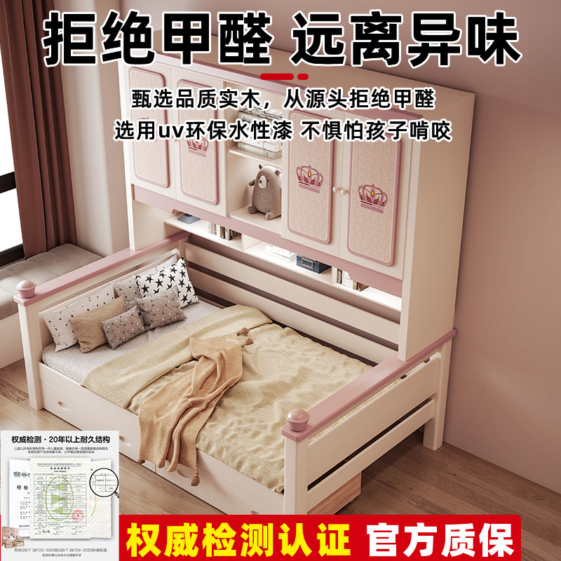 全实木衣柜床一体组合儿童单人床女孩粉色公主床小户型储物榻榻米