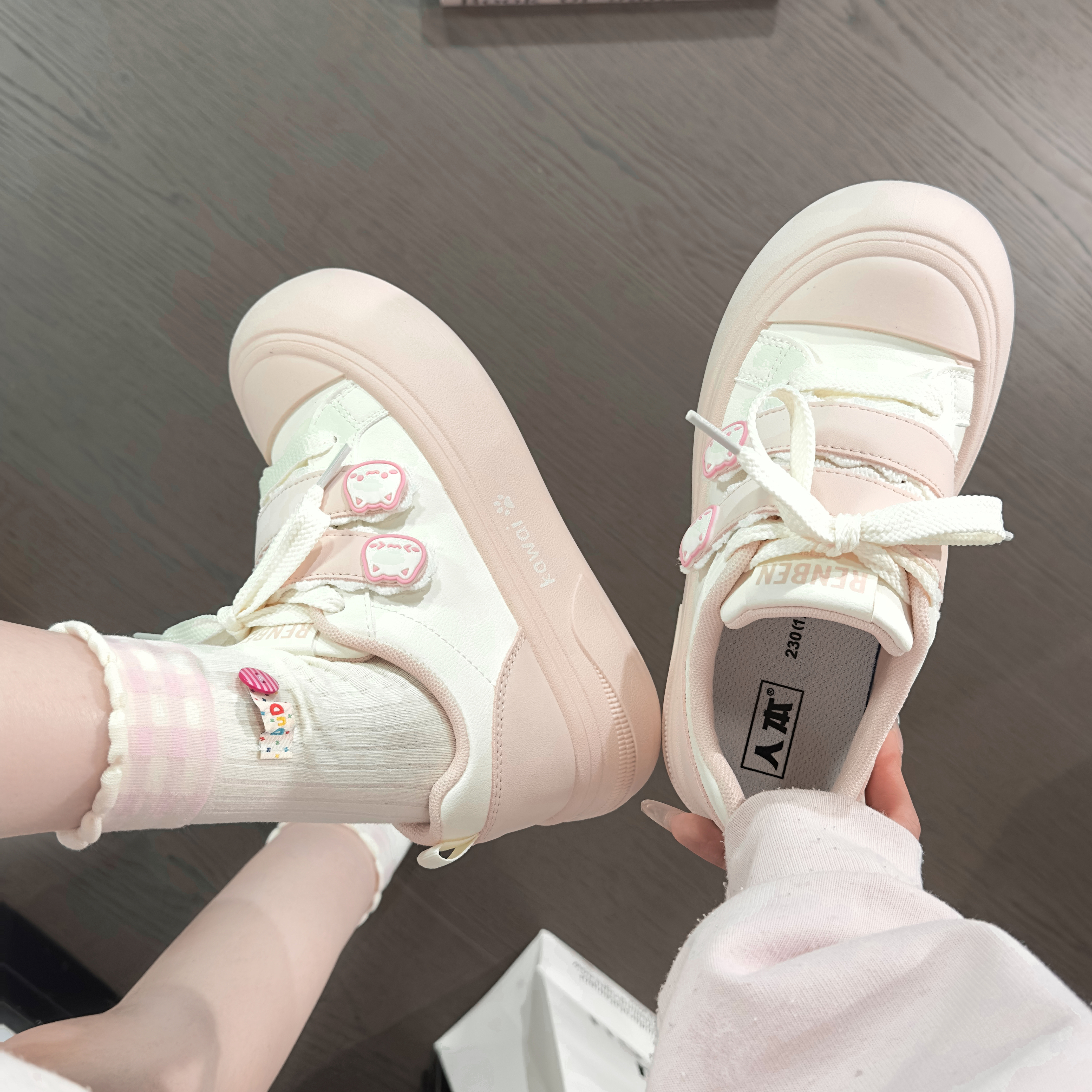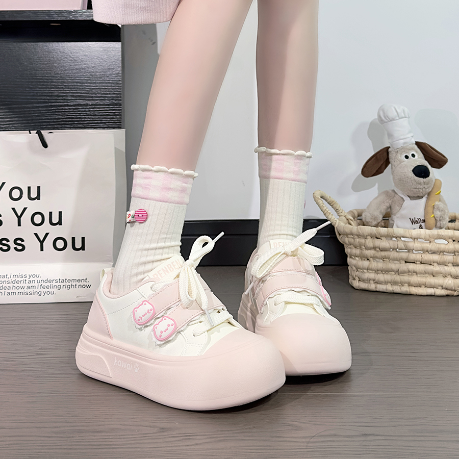 人本粉色可爱皮面女鞋魔术贴少女小白鞋女2025爆款大头鞋百搭板鞋