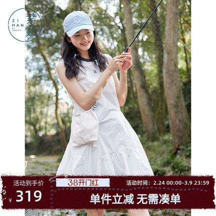 紫涵撞色圆领白色无袖背心连衣裙女夏季新款法式a字短裙透气户外