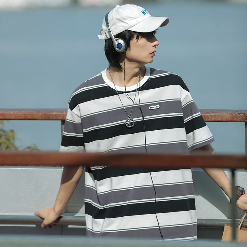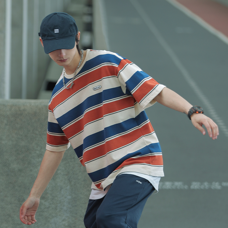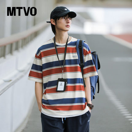 迈特优美式复古街头条纹圆领短袖T恤男夏季潮ins宽松情侣体恤
