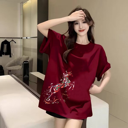 红色短袖t恤女纯棉马年本命年衣服2026年新款国潮设计感新年上衣