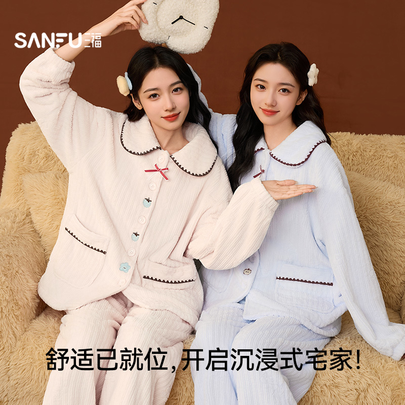 三福女冬季格子绒绒抗静电睡衣套装柔软宽松可外穿保暖长袖家居服