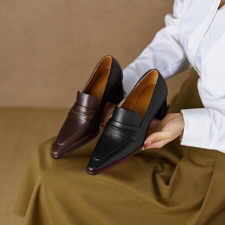 英伦风小皮鞋女粗跟乐福鞋时尚百搭复古棕色中跟真皮尖头深口单鞋