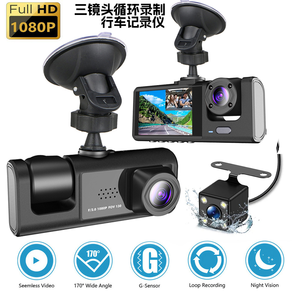 高清行车记录仪1080P三镜头车前车内车后倒车影像车载录像摄像头