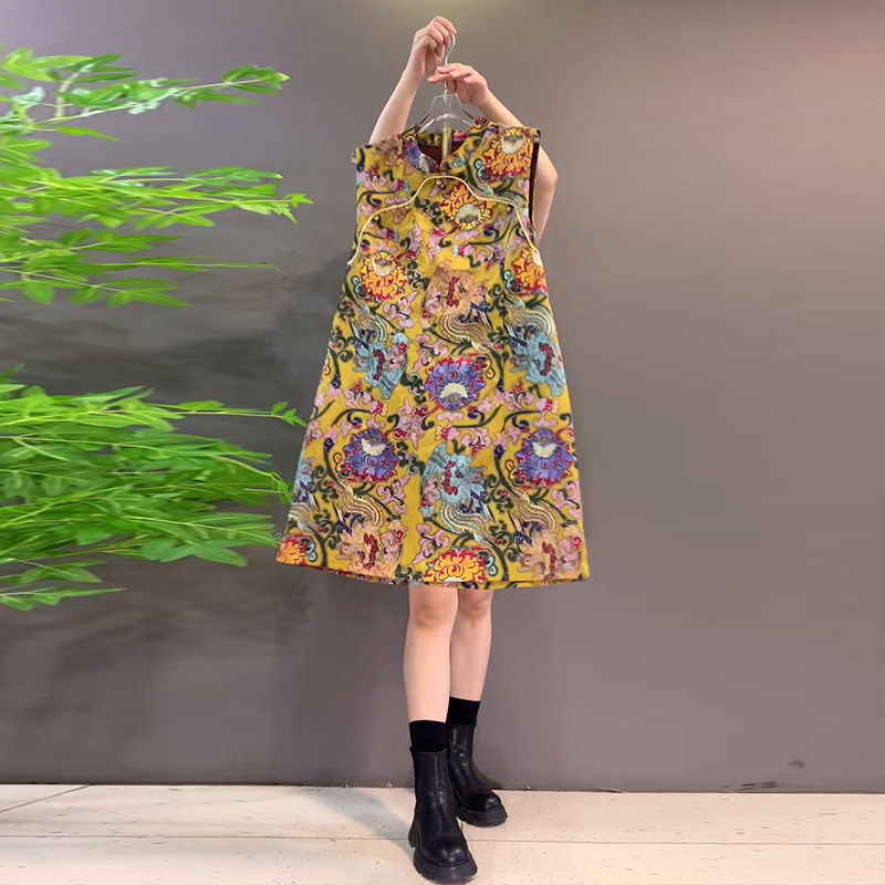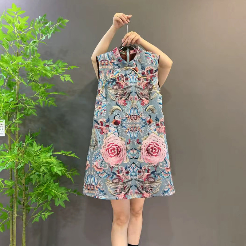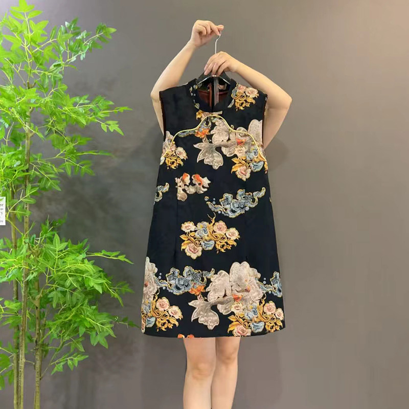 加肥女立领无袖花朵连衣裙胖MM法式复古风夏季款洋气设计感旗袍裙