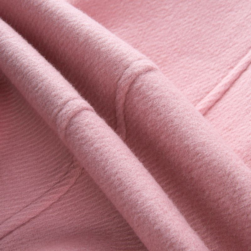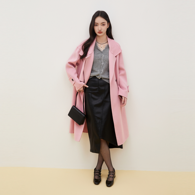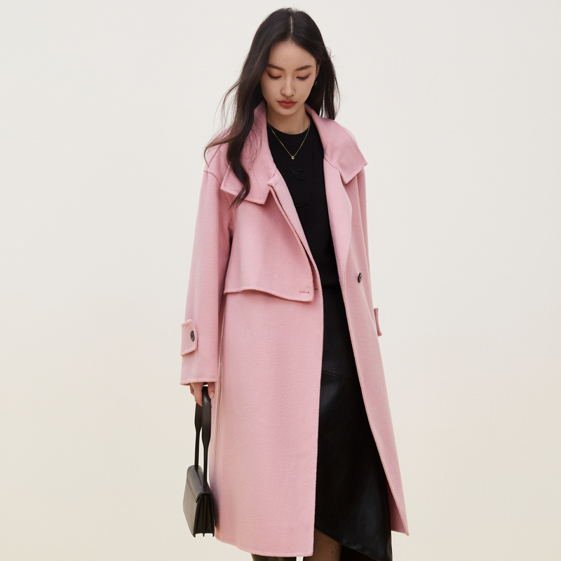 XG雪歌中长款玫红色长袖风衣2024冬季新款淑女风宽松羊毛外套女装