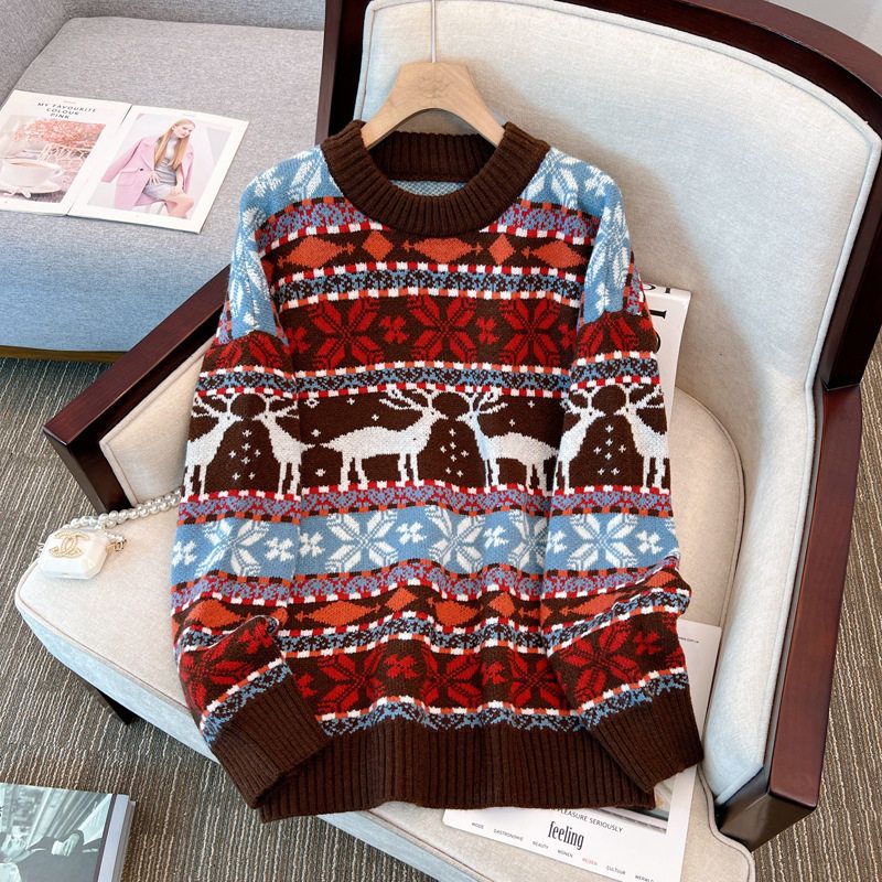 复古小鹿提花圣诞毛衣女2024秋冬季新款韩版宽松套头针织衫上衣潮