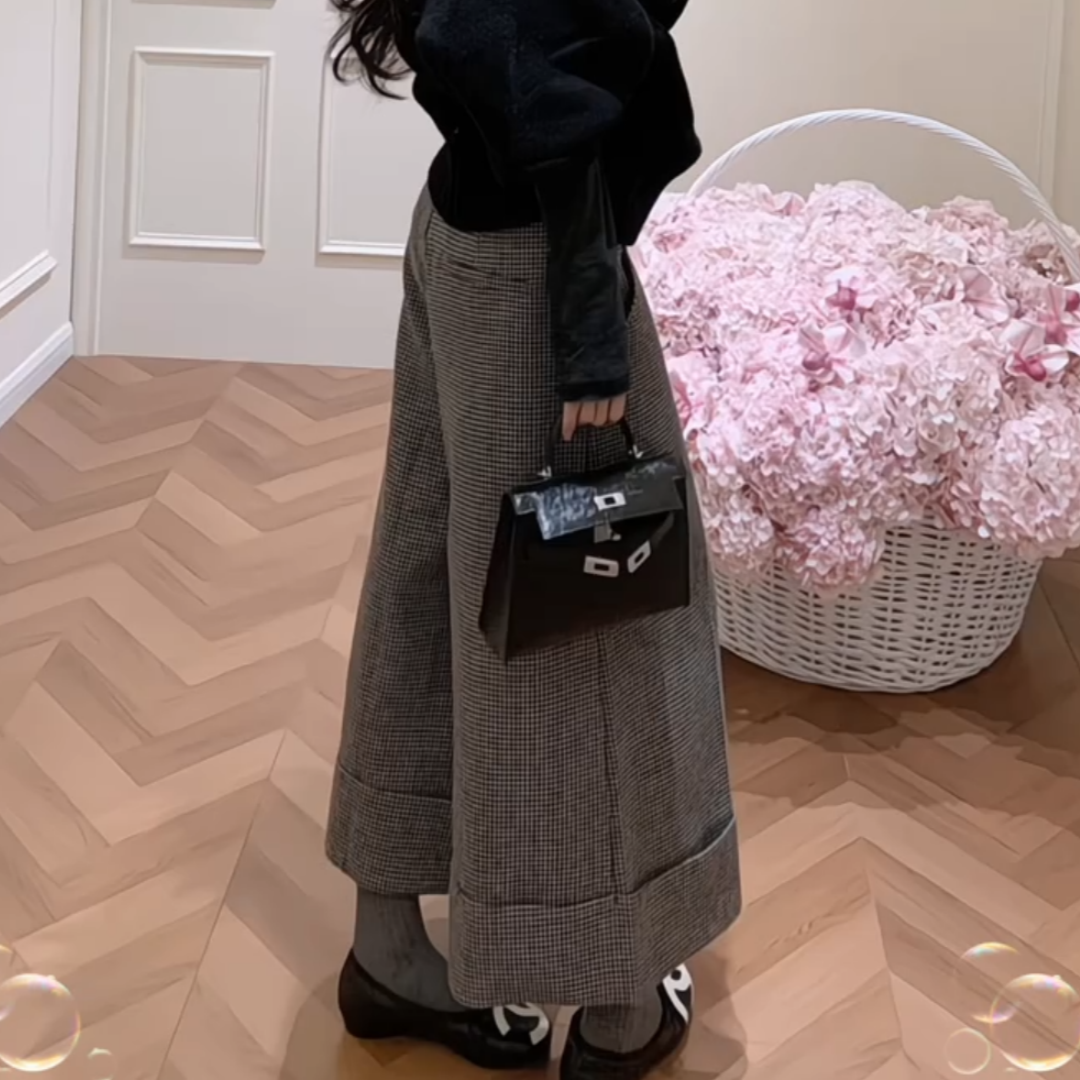 老钱风折叠裤脚格子毛呢垂感九分裤女冬季时尚百搭高腰显瘦阔腿裤