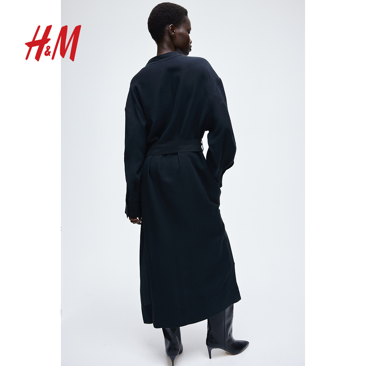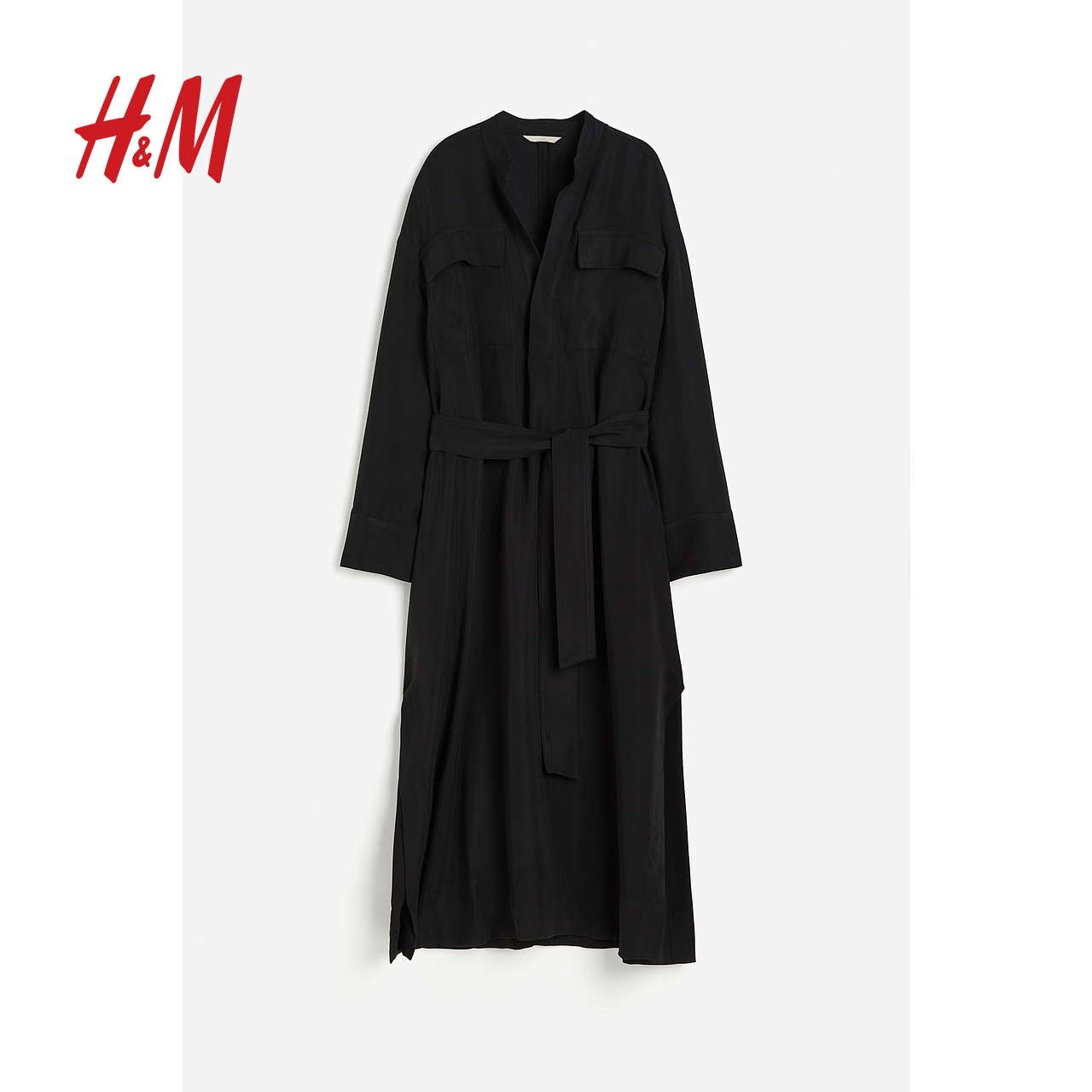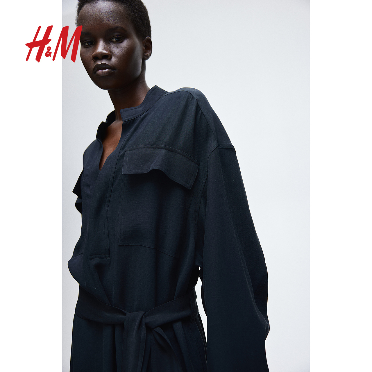 HM女装连衣裙秋季休闲气质V领落肩长袖莫代尔长裙1225983