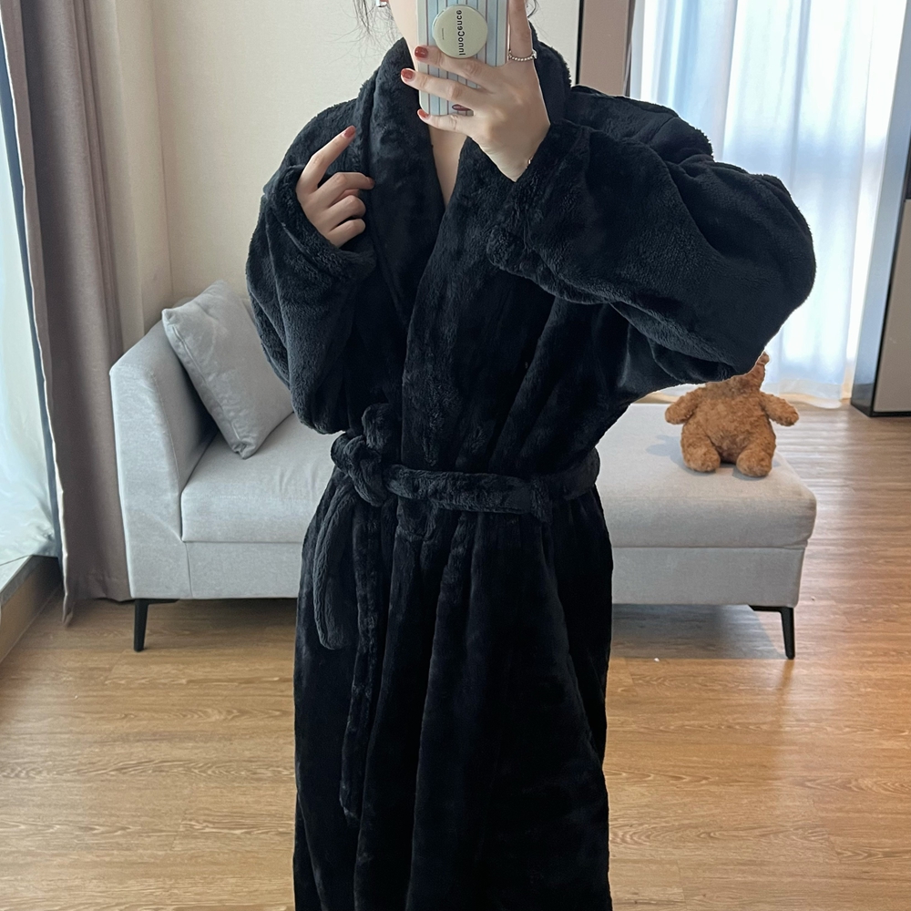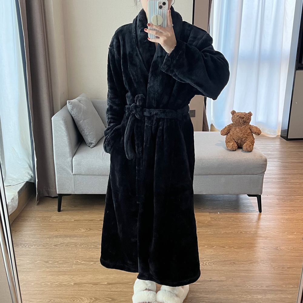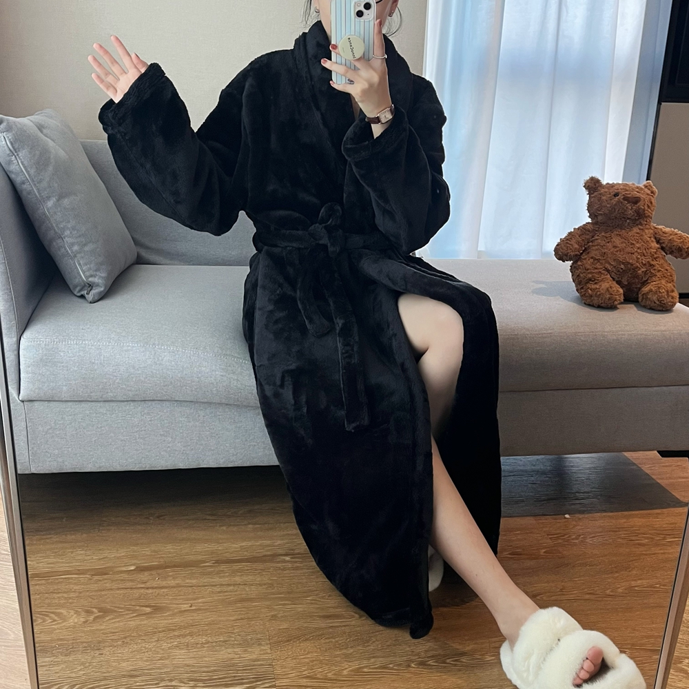 高级感大码睡衣女冬加长款加厚黑色显瘦浴袍法兰绒长款睡袍居家服