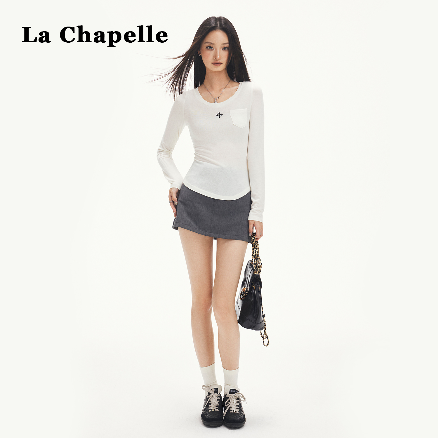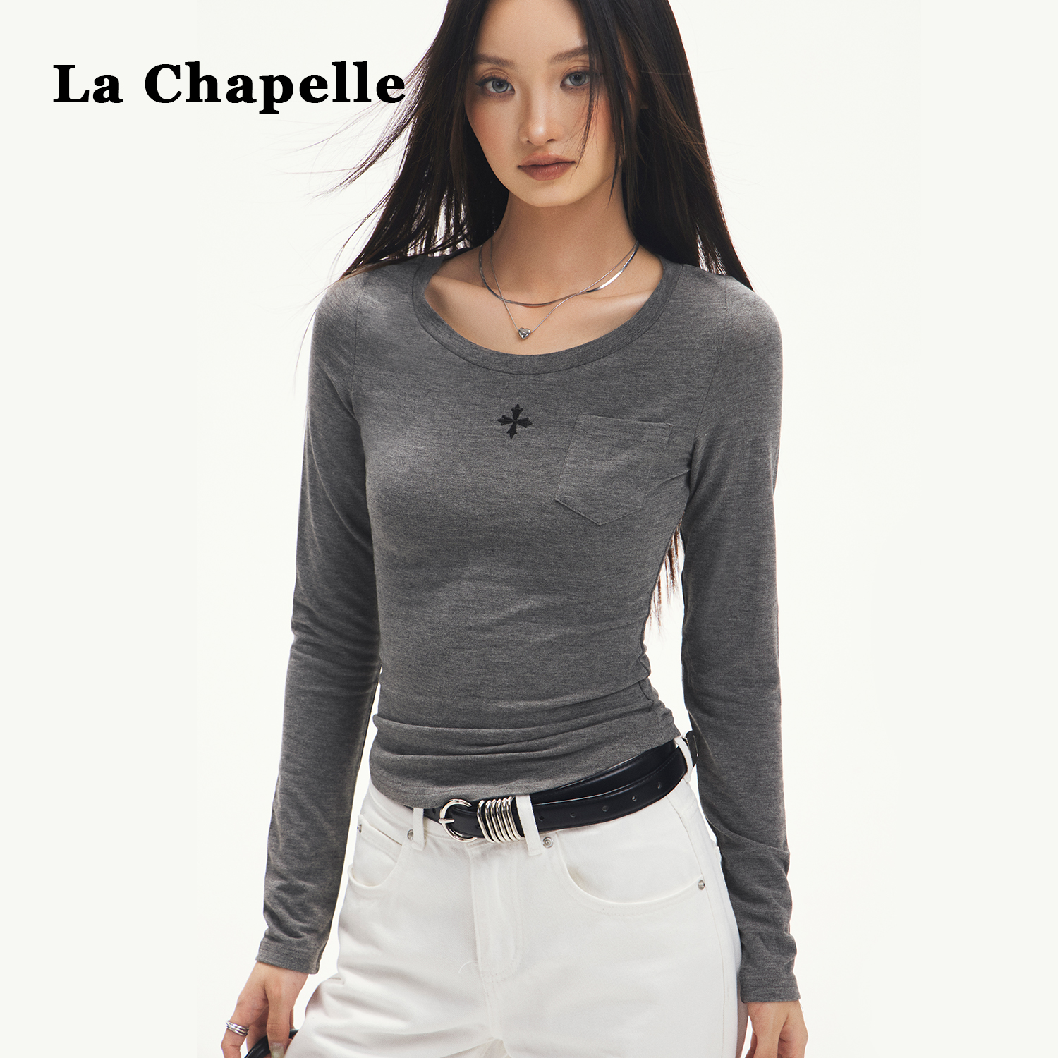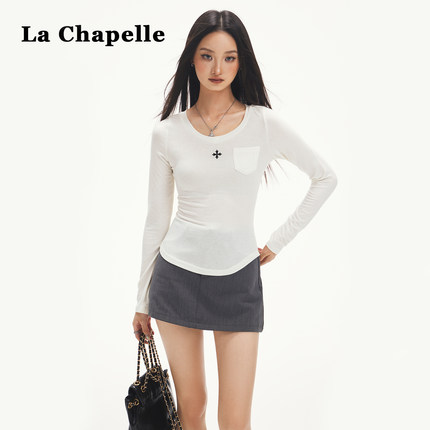 拉夏贝尔韩系圆领长袖内搭打底衫t恤女2025新款早秋chic别致上衣