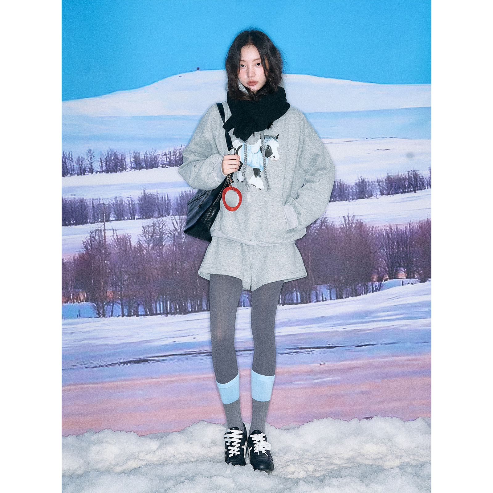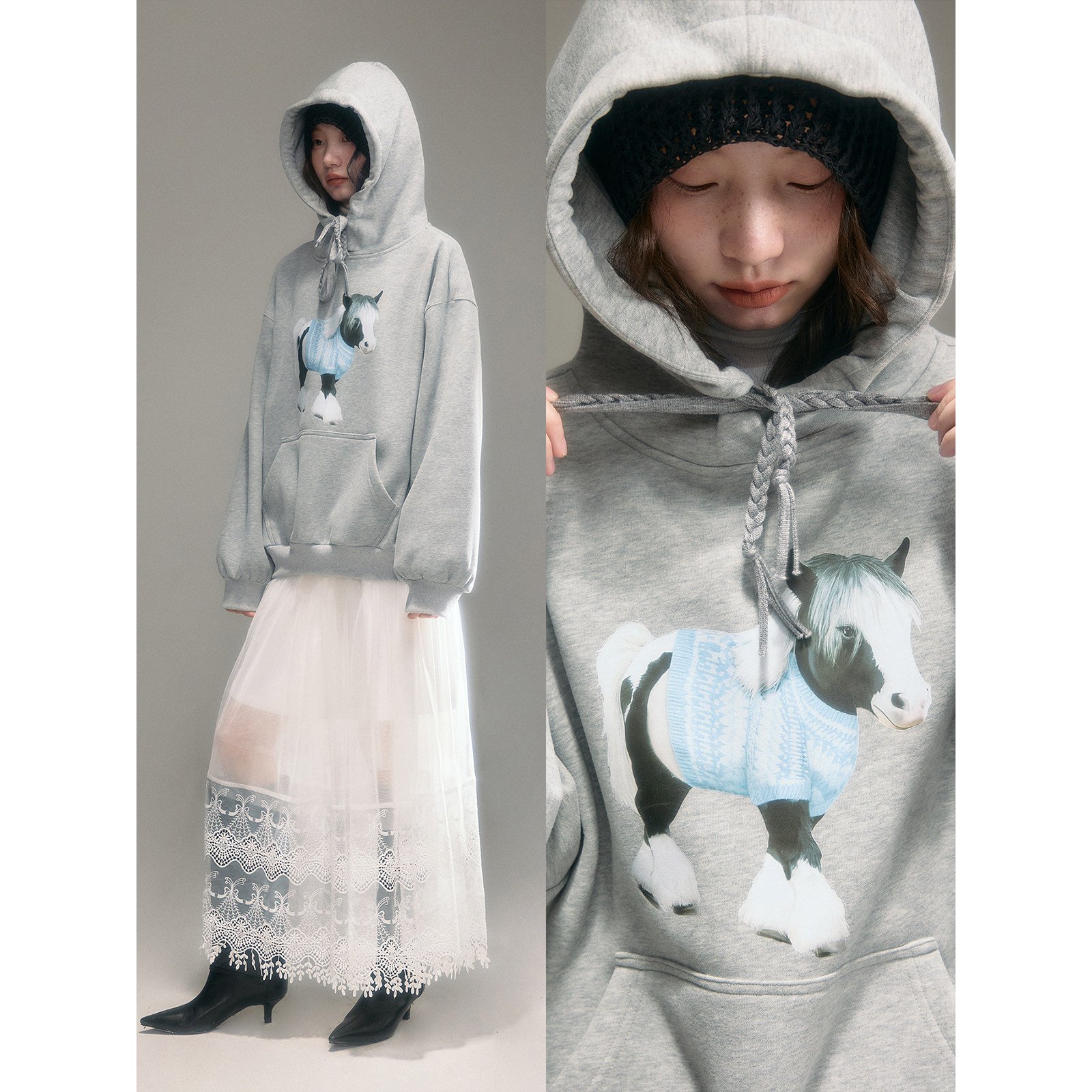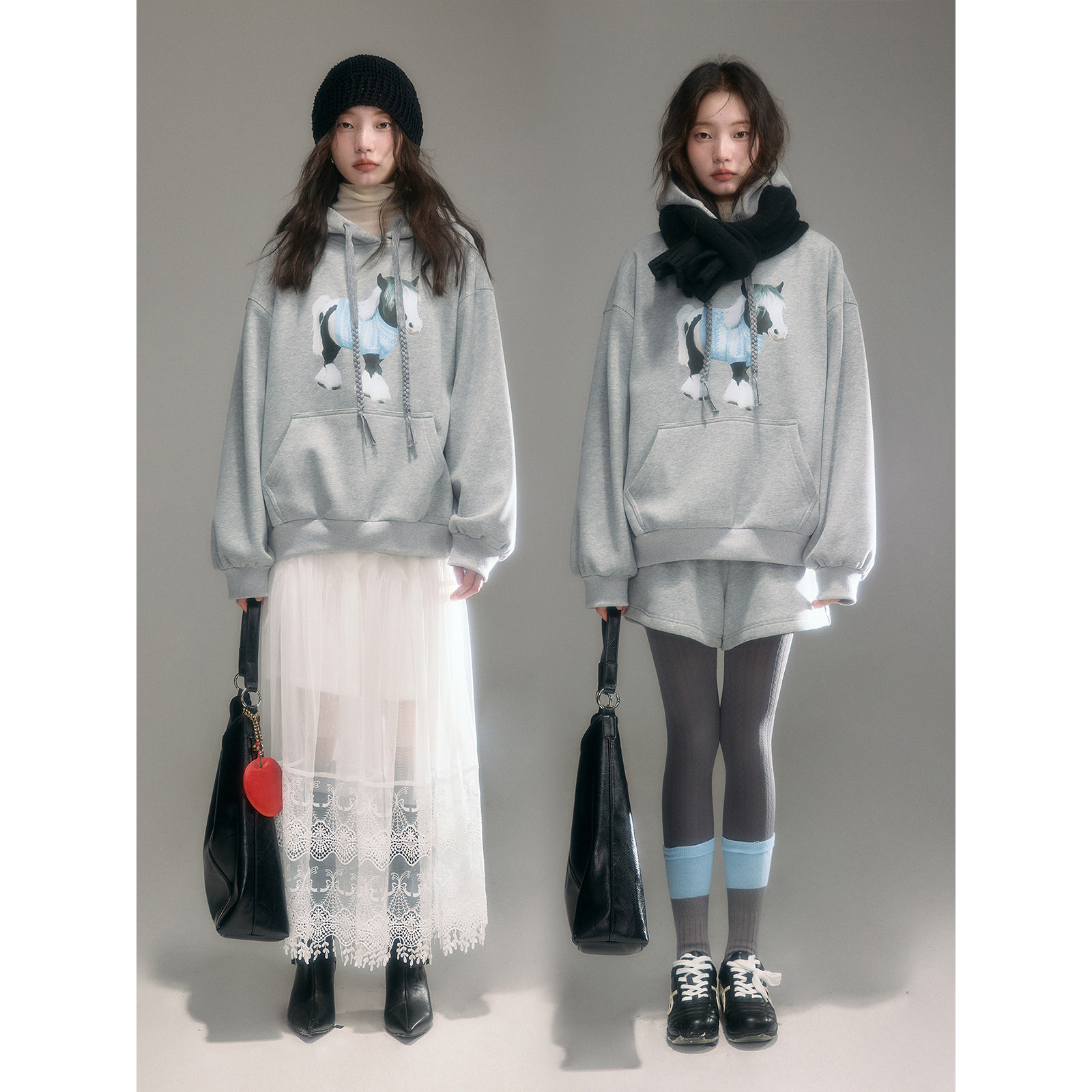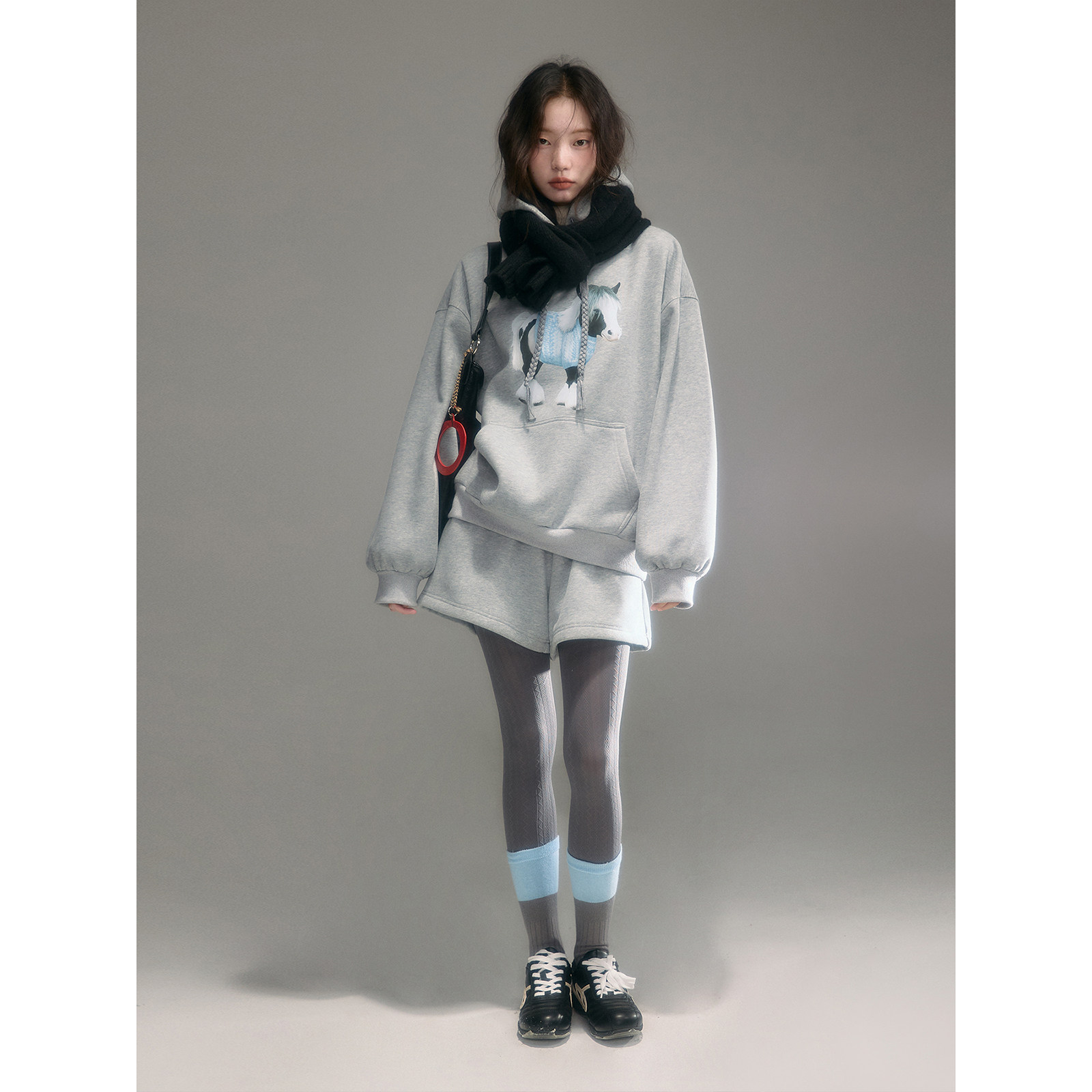 有耳uare原创设计 pony club 小马印花加绒连帽卫衣短裤套装