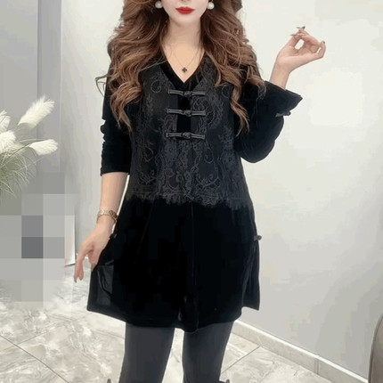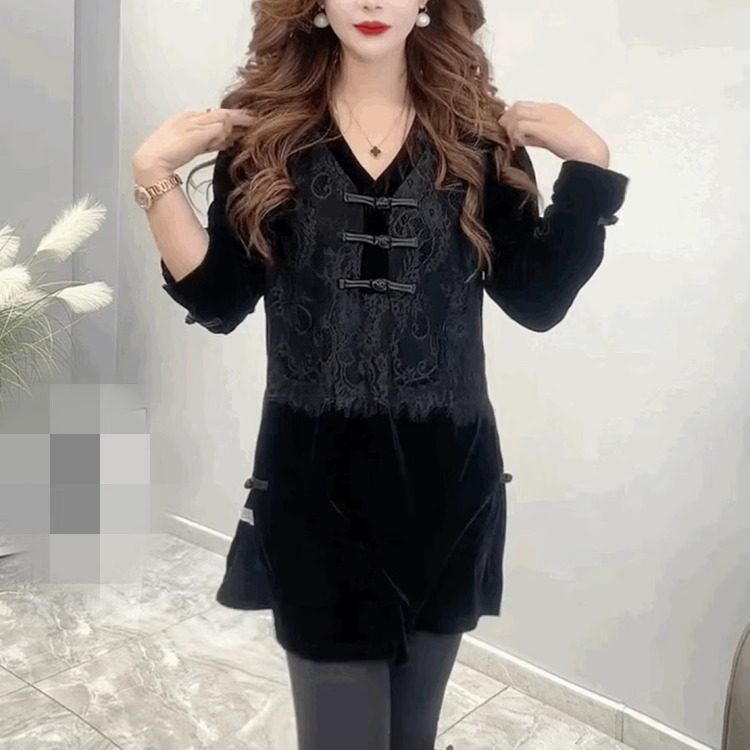 蕾丝拼接丝绒中长款T恤打底衫女盘扣复古宽松显瘦V领黑色遮臀上衣