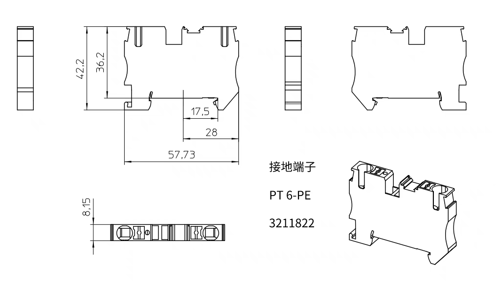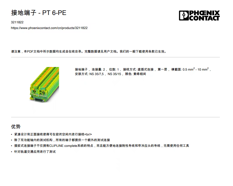3211822菲尼克斯phoenix contact 直插式接地端子排 PT6-PE 正品