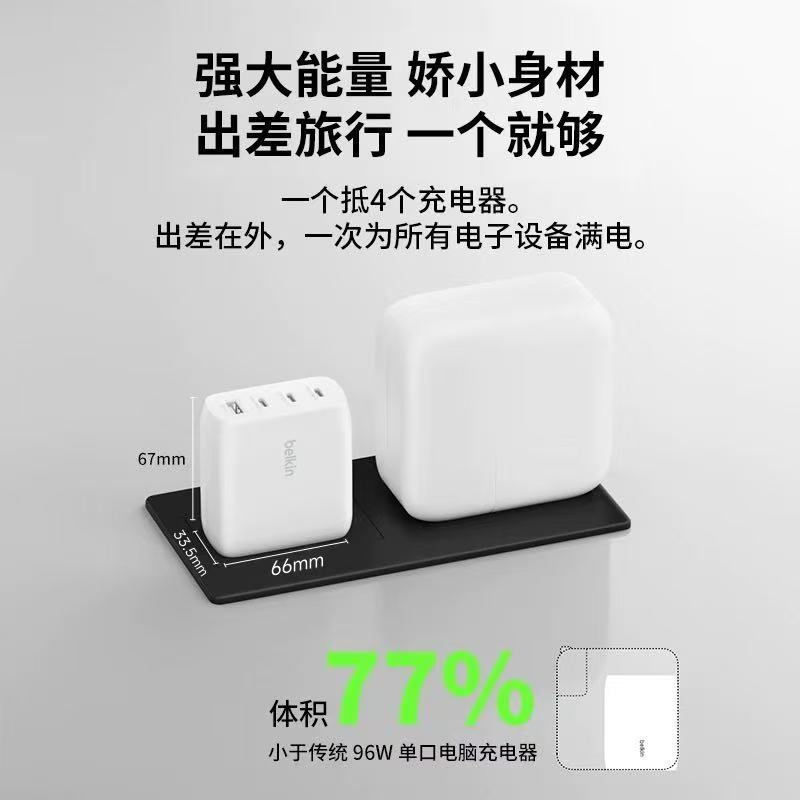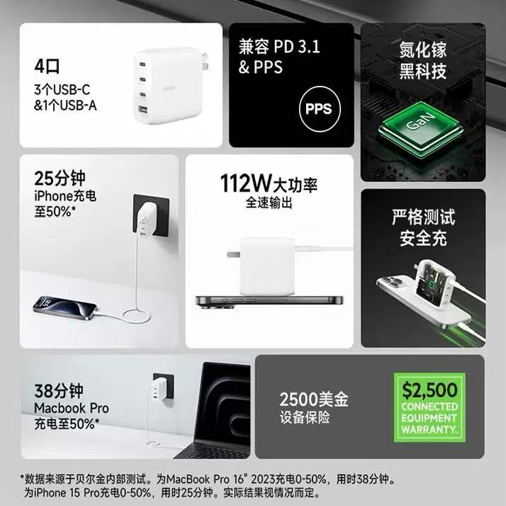 Belkin贝尔金112W四口充电器口氮化镓PD多设备兼容适用苹果15iPhone16ProMax/14手机笔记本Mac iPad快充插头