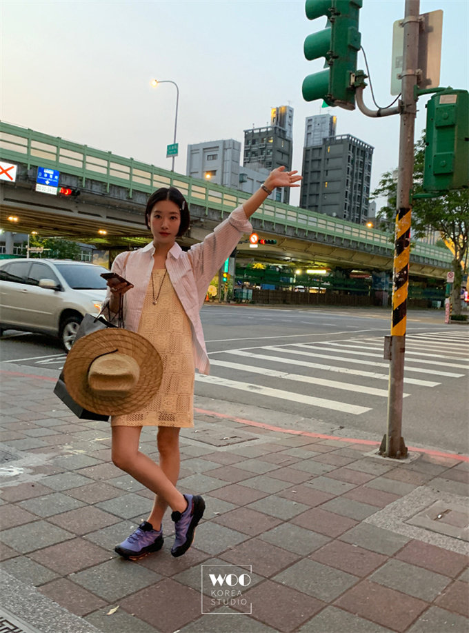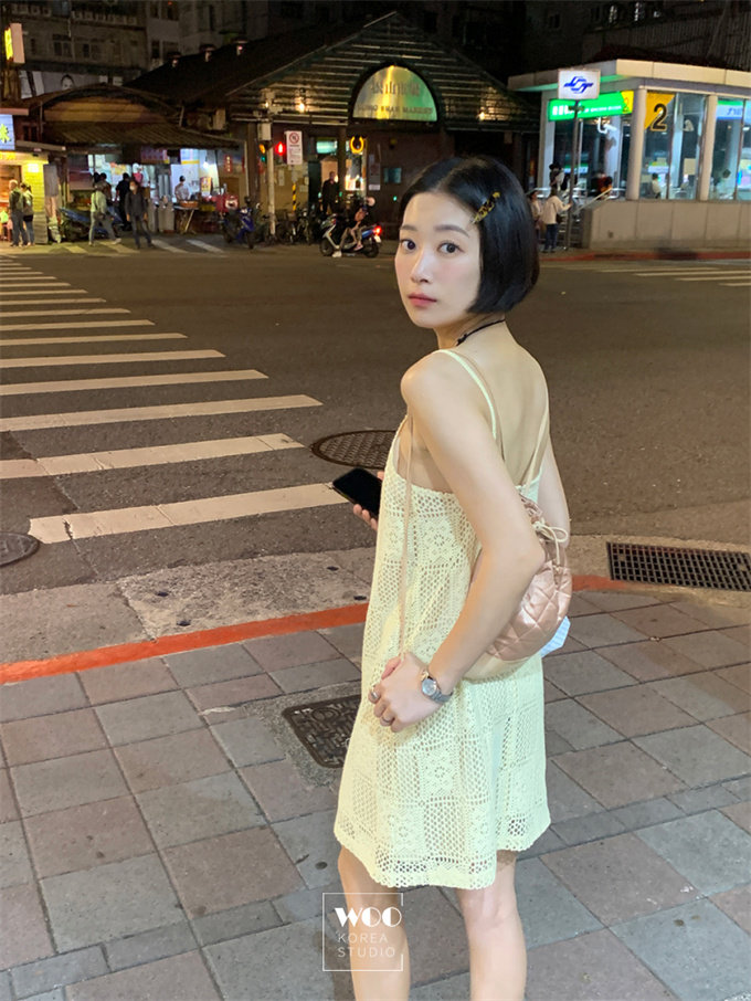 Exclusive type 夏日简约可爱奶酪黄钩花蕾丝镂空显瘦吊带连衣裙